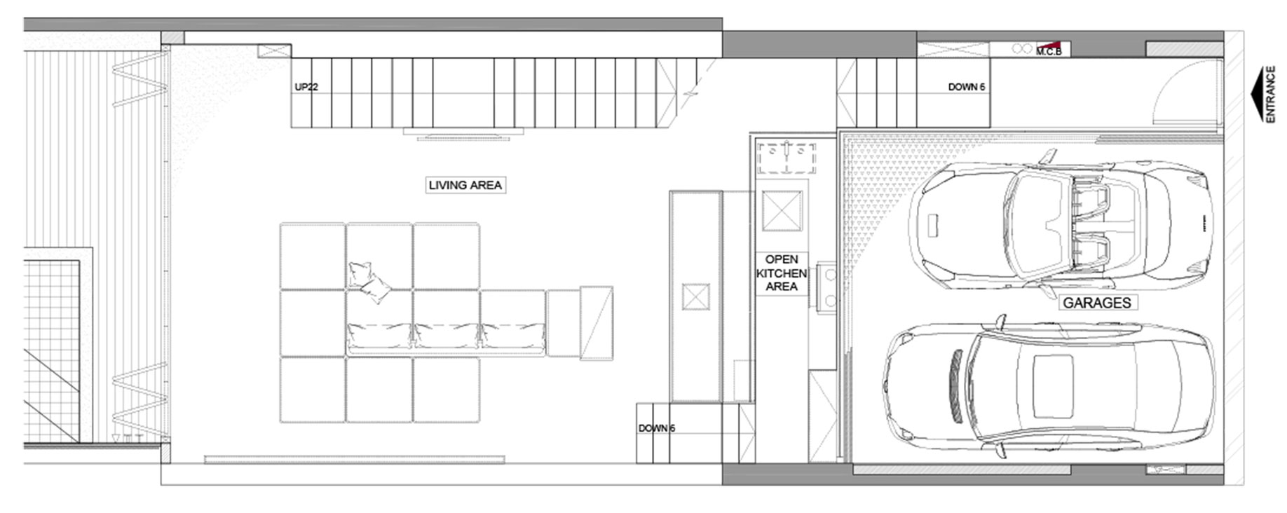 One of the most impressive and eye-catching features of this amazing home comes in the form of a garage that features glass walls and was placed right above the open kitchen area. This garage has enough space for 2 cars and allows the owner to keep his or her favorite ride in visual contact at all times. This theme of transparency carries on to the master bedroom, which features a glass bathroom as well as floor-to-ceiling windows.