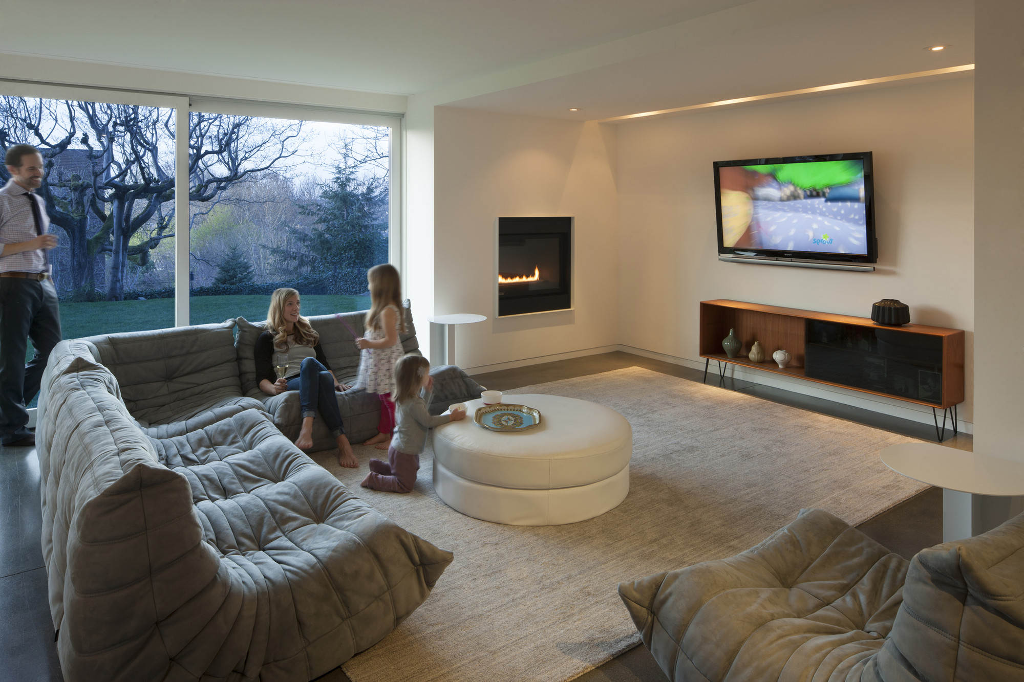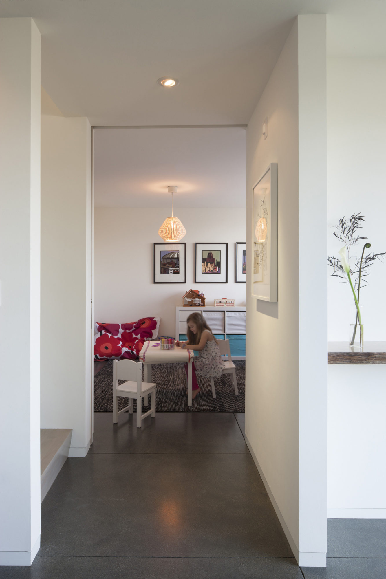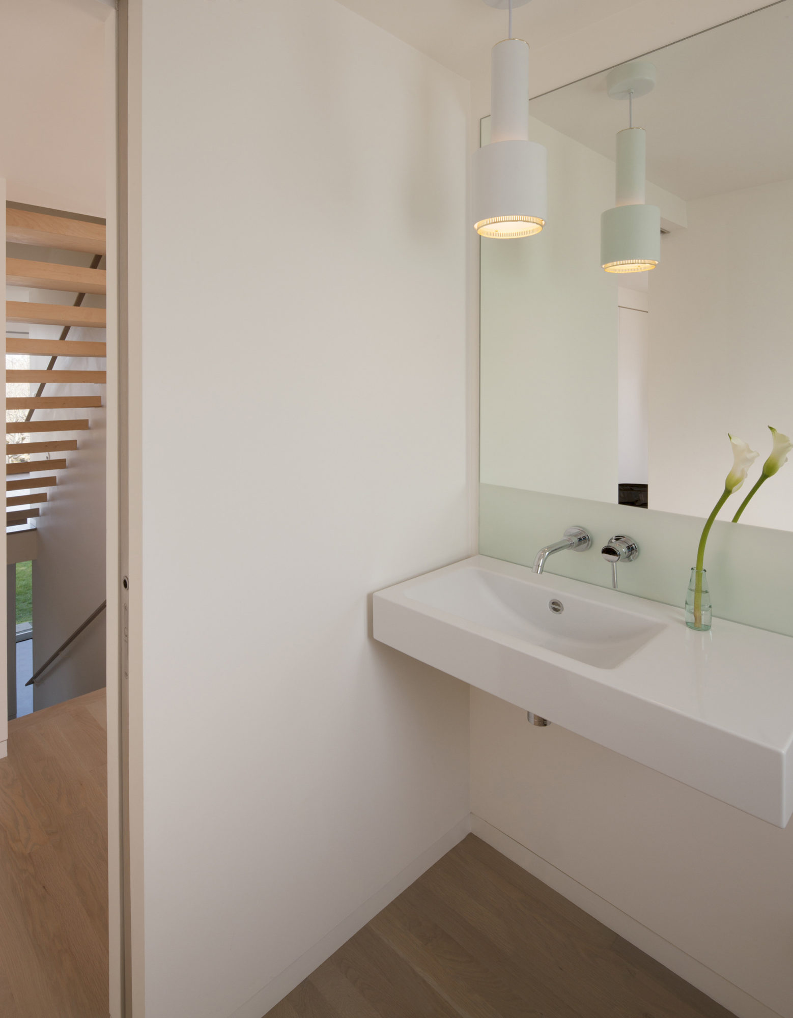 Interior surfaces include light grey washed oak flooring at the main level, integral color concrete slab at the lower level, painted gypsum board with flush base trim, tile and ipe bathroom surfaces, and quartz counters. Bathroom fixtures are by Duravit and kitchen appliances are by Miele. Hydronic radiant heated floors serve the immersive, comfortable, and durable environment.