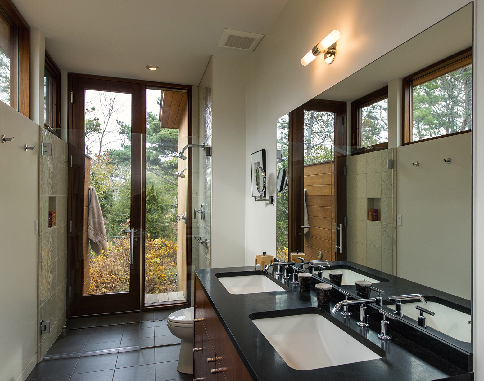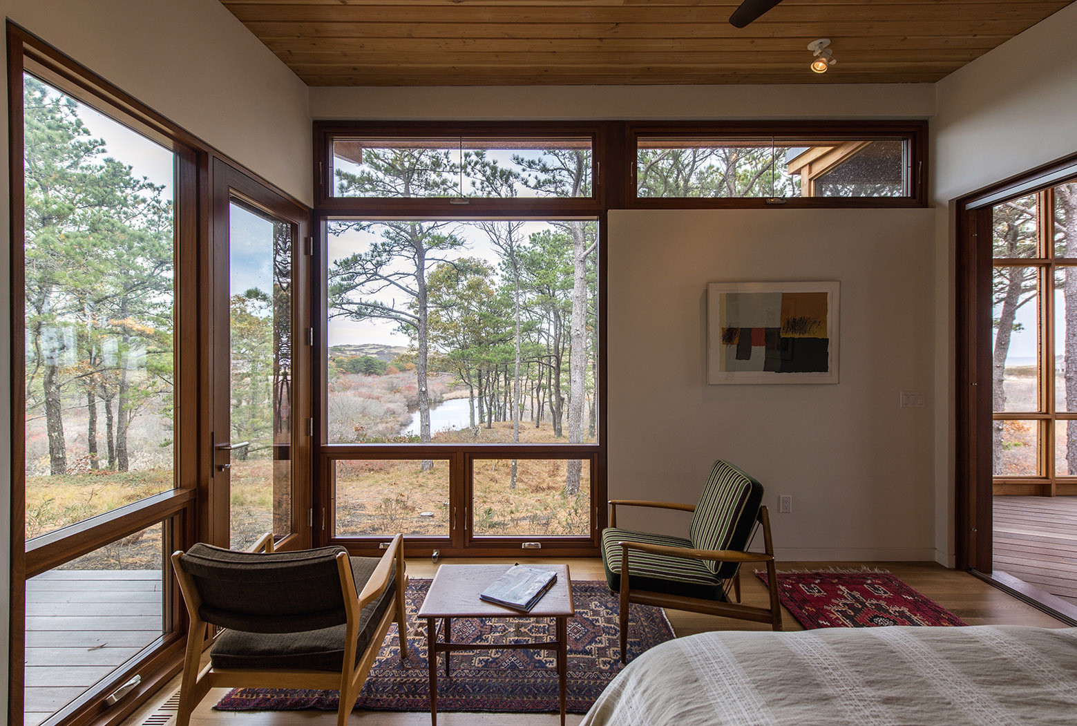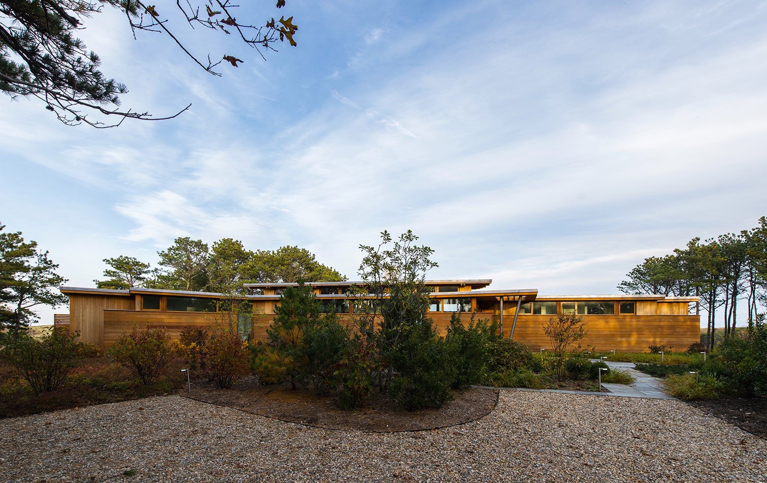 One wing of the house provides the guest bedrooms, while the other wing, which is rotated forty-five degrees in plan, contains the master bedroom suite. A screened porch with a referential kite shaped roof occupies the intersection of the two geometries providing views in all directions. Active and passive solar design incorporating photovoltaic panels and deep roof overhangs with ventilating clerestory windows, promotes natural cooling and ventilation, while shading the interior in the summer months.