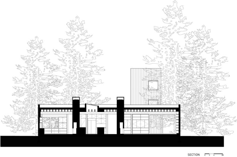 The structure is long, low, and narrow, settling into the tree-lined landscape and allowing yards to surround and permeate each room. A 3-story tower and roof deck emerges among vibrant evergreens, providing a unique vantage point of the surrounding townscape.