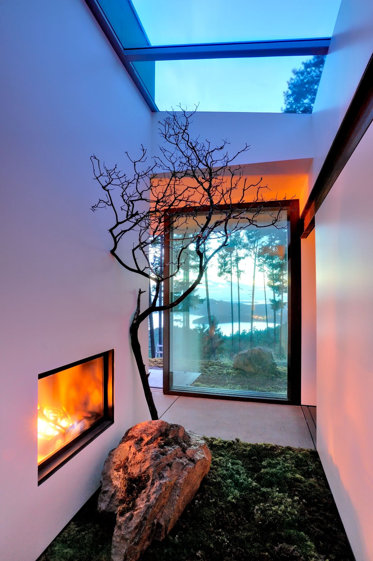 The solution utilizes some of her favorite materials; old barn wood, rusty steel, moss and rocks. Large doors slide away to open the house to the expansive views, creating a living room in the woods. The entry garden bisects the house creating two zones while it carries the site and the eye out to the view. The 800 s.f. art studio and storage area are left raw to facilitate converting them to additional bedrooms at a later date.