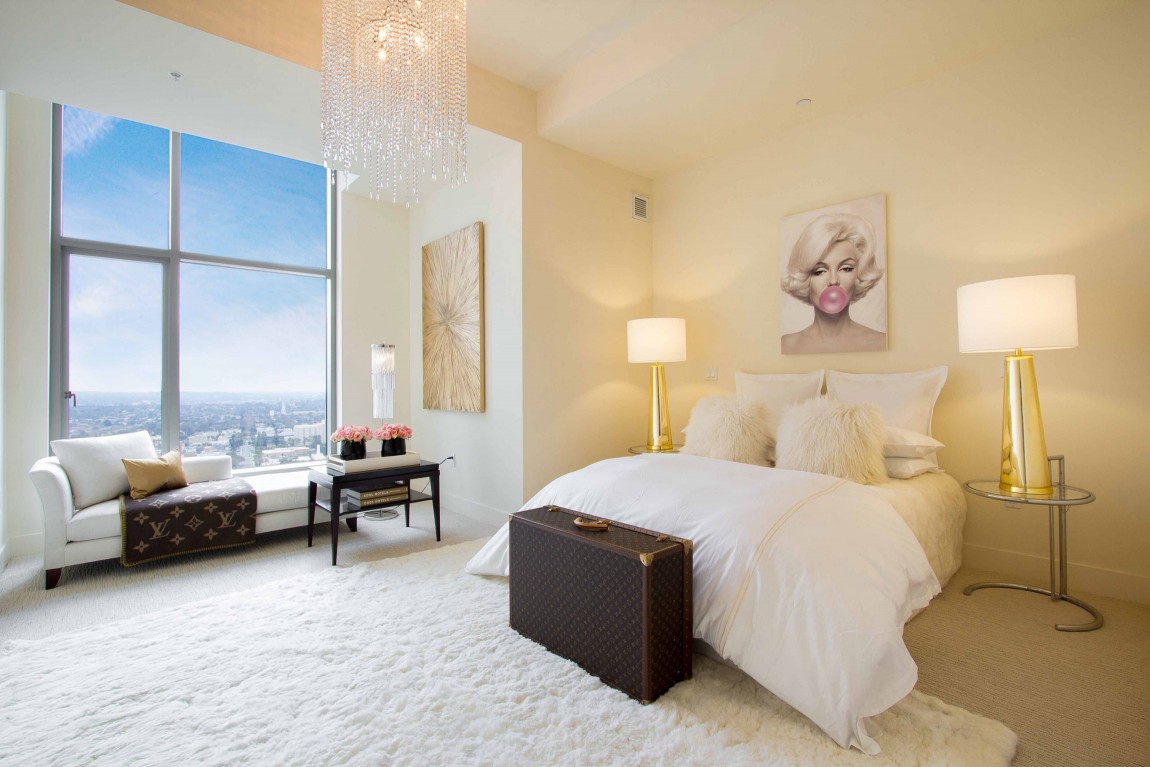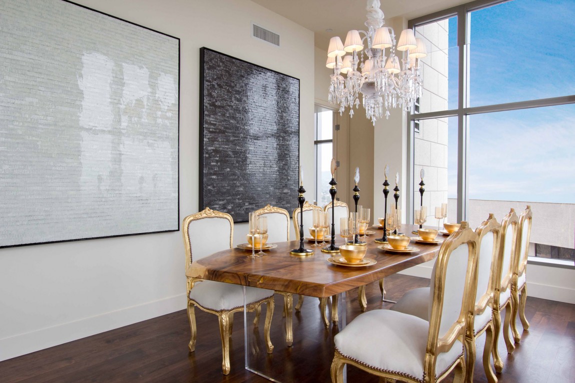 Hand-selected art pieces including images of pop icons Marilyn Monroe, Audrey Hepburn and film classic The Magnificent Seven adorn the living spaces and bedroom walls, provided by Art Angels, while a modern aesthetic augmented by the sophisticated color palette of creams, white, silver, black and gold permeate the space. In the dining room, Premier Stagers has decidedly paired eight ornate white and gold chairs from Melrose Gallery together with an Eco Slab Table from ModShop in a natural Acacia wood finish.