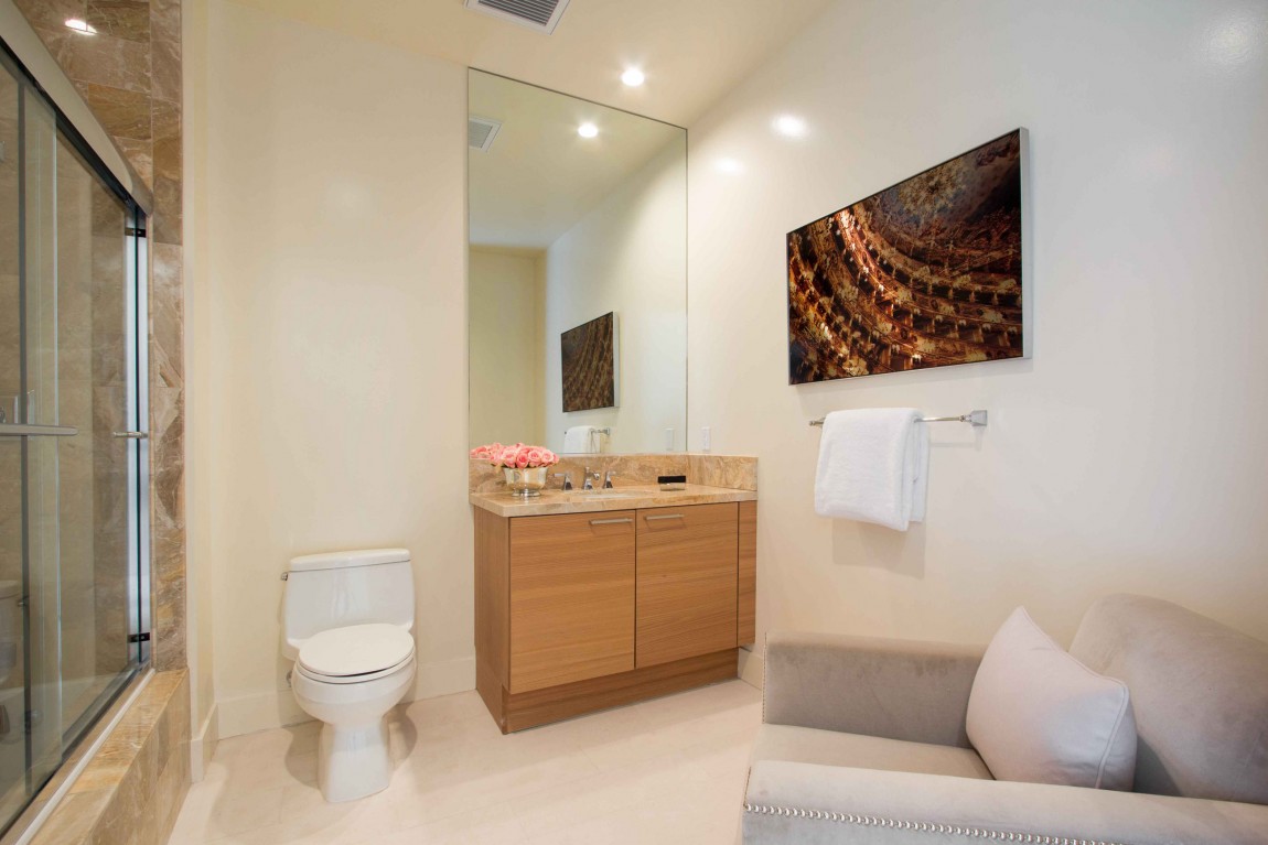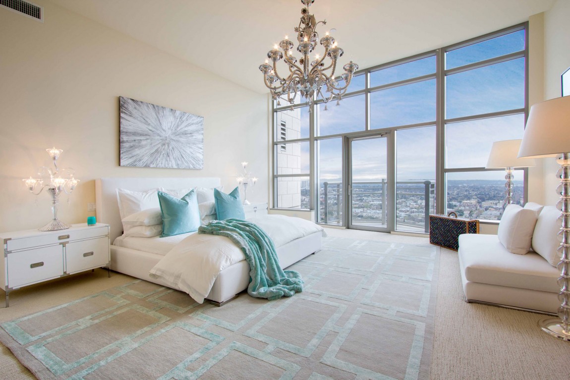 The living room is adorned with an oversized white bamboo silk rug from Modern Rugs LA, a crisp white sofa paired with four sofa chairs provided by Premier Stagers, and two Diva Cocktail Tables finished in black lacquer from Baker. Other standout pieces adorn the bedrooms – in the master, there are two blown glass table lamps and a chandelier from Melrose Gallery together with Italian-made Crystal Ball Floor Lamps from Baker and Jet Setter side tables from ModShop; and in the third bedroom, a tufted Chesterfield sofa in cream from ModShop and two gray ottomans from Premier Stagers. Other décor throughout includes plush seating in the master baths, Alcapa-inspired rugs and bedding, and fun accessories from Louis Vuitton and elegant lighting.