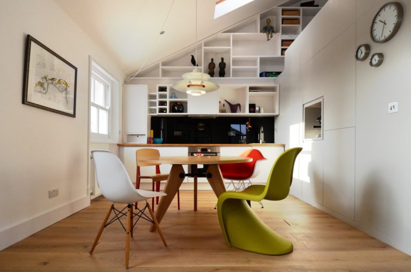 The assignment was to turn a former open plan office space into an innovative environment perfect for living in London. To obtain a relevant result, the architects had to maximize the sense of space, maintaining in the same time a simple and efficient layout. It was introduced a single volume that divided the open plan into various spaces for different uses like kitchen-dining, living room, storage, bathroom and also a mezzanine meant for sleeping and working.