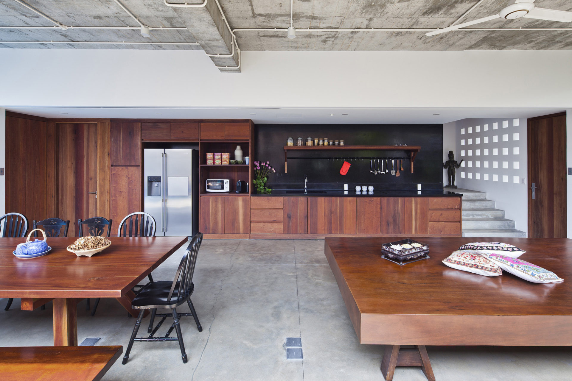 The raised ground floor with the kitchen, the dining and the platform area, is one single space, fully open on three sides from the front yard, the garden to the pool in the back. High fence walls provide privacy, prevent from direct sun light and intrusion.