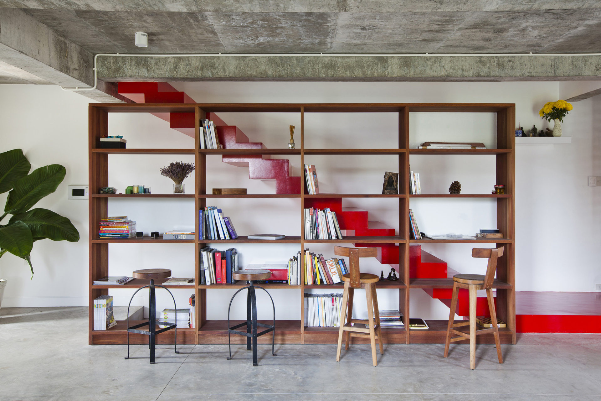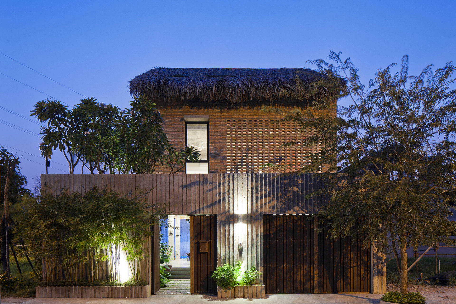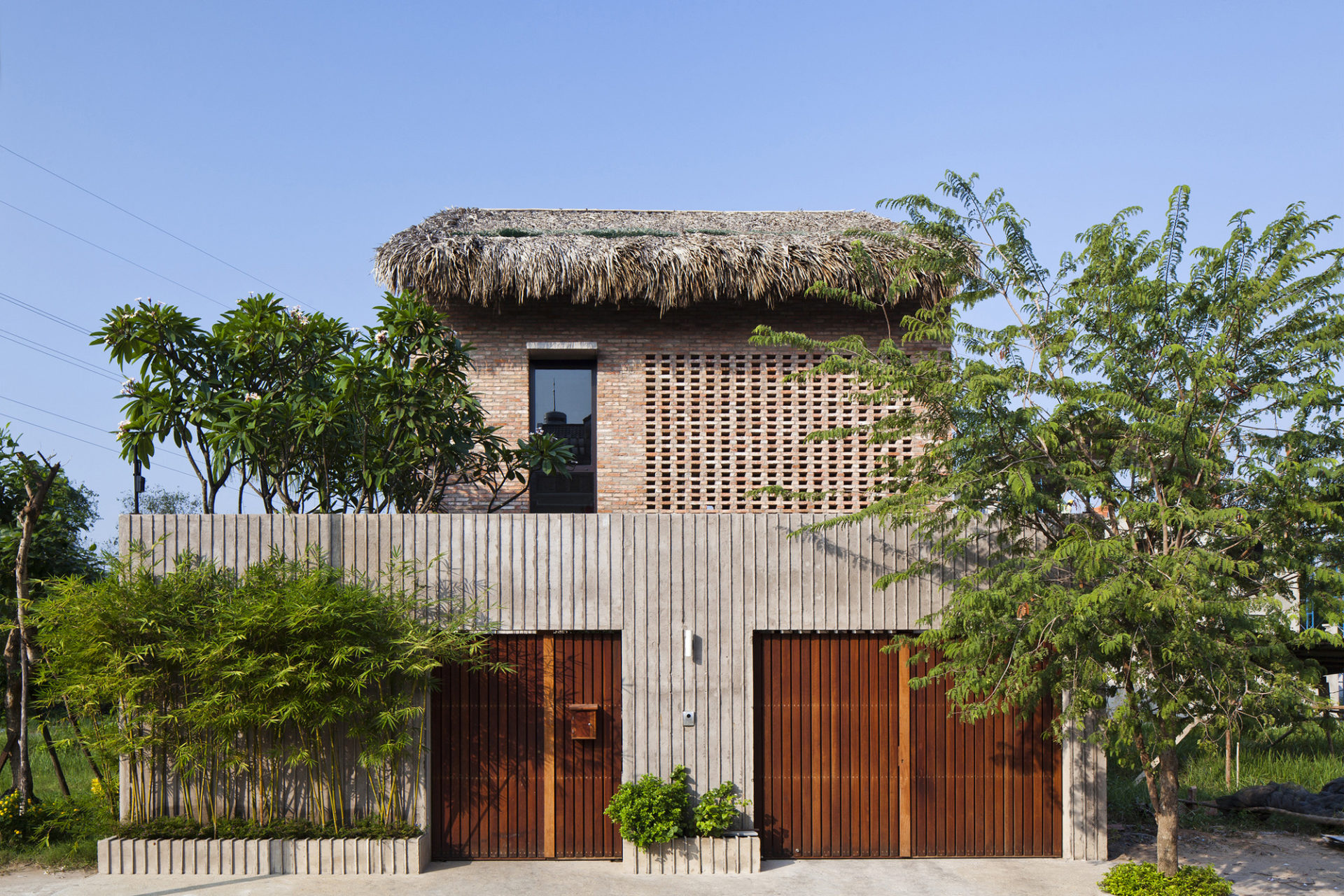 The ground floor is slightly raised from the ground and incorporates the kitchen, a dining area, and a platform area, all of which open up to a swimming pool at the back and to a yard at the front. In order to ensure the privacy of the inhabitants as well as to prevent excess sunlight, the architects placed high fence walls around the perimeter of the house. The building is also surrounded by trees and growing plants. Excess rainwater is prevented with the help of bamboo screens, and an automatic shutter system secures the ground floor during the night. The first floor is accessed via a staircase, which leads the way to the living room. The attic includes a large bedroom and boasts sliding windows as well as an open-air bathroom.