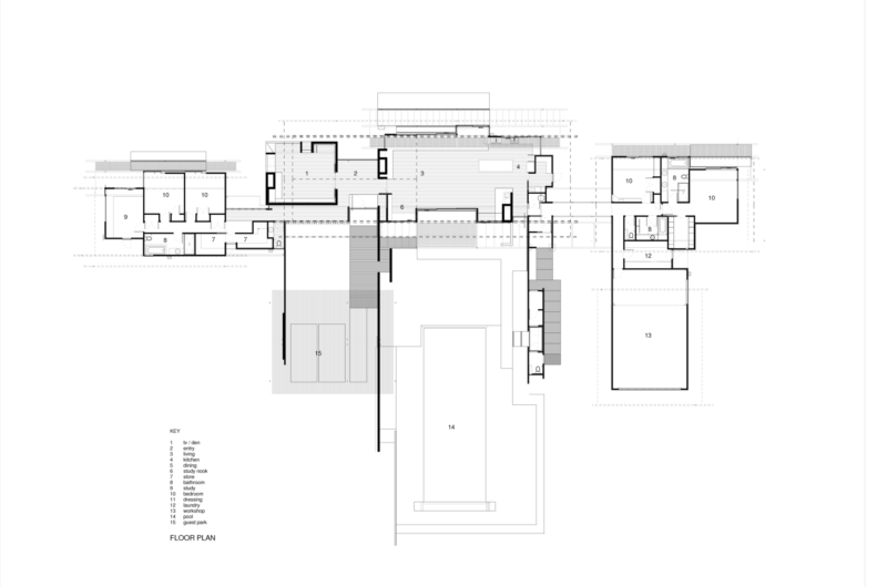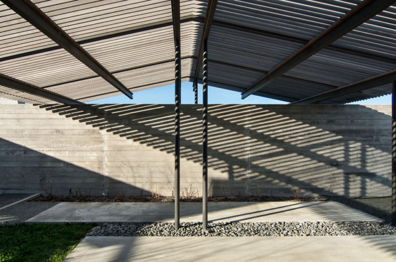 Pavilions form the structure of the house. Each pavilion has a different purpose but they are all connected by the feeling of openness that they give to the inhabitants. To integrate the building into the scenery, the architects went for linear walls made of concrete.