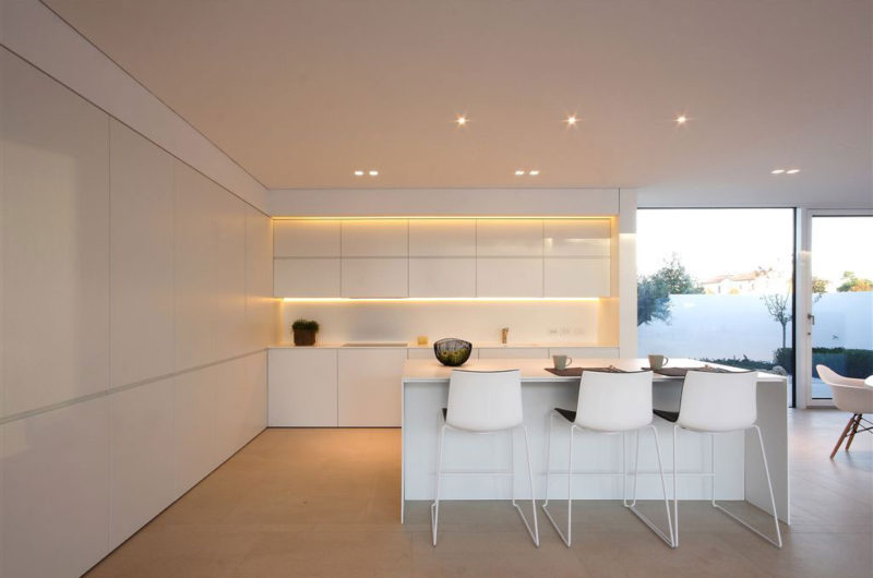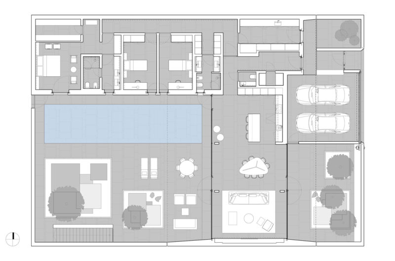 Because of the small sized plot, the architects had to concentrate on leaving as much open space as possible, so they equipped the indoor living area with transparent sides that open towards two distinct-sized patios: the large one to the west that features a long swimming pool and two planted square inserts with an olive tree, and the smaller patio that also features two planted inserts with another olive tree to counterbalance the other side.