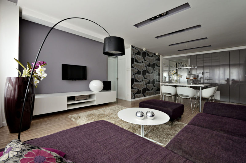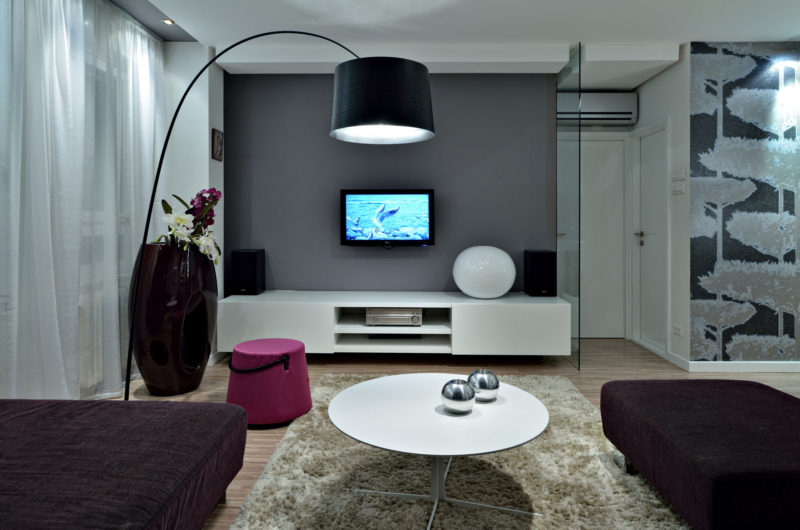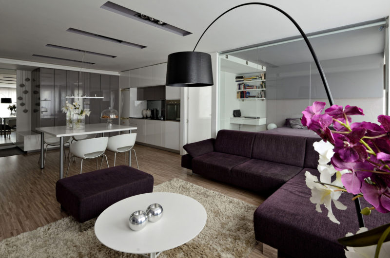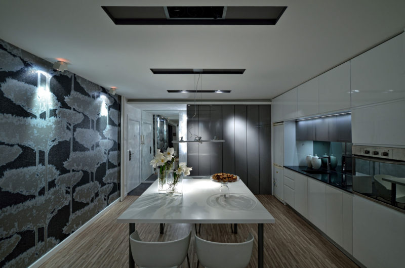 Speaking of the kitchen, it is well equipped and boasts a few hidden doors that mask a pantry and a laundry room. The private area of the apartment, the one that includes the bedrooms, is separated from the rest of the abode by a glass wall. The core of the residence is occupied by the living room, which flaunts a comfortable sofa, a flat screen TV and a small coffee table.