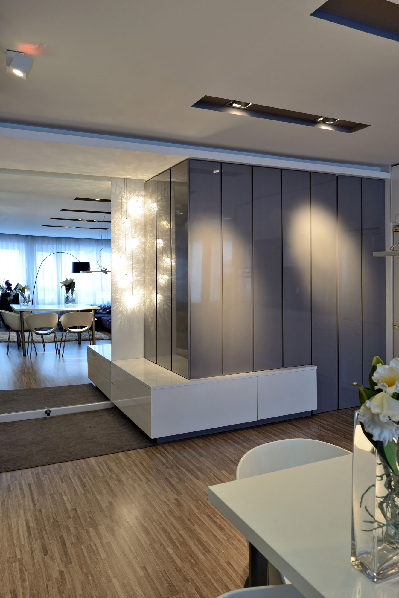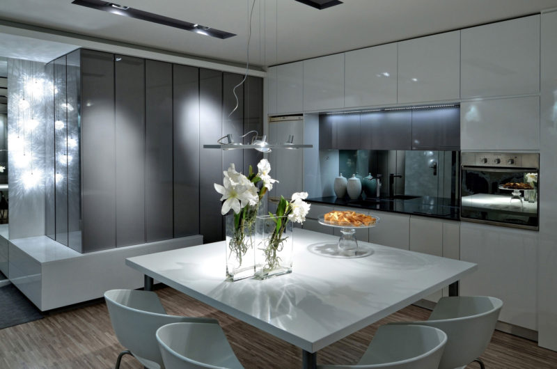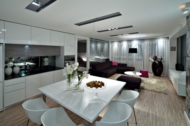 This contemporary two-bedroom apartment was designed by Biljana Turanjanin Pujo of PUJO.RS, and it can be found in Belgrade, Serbia. It features an intimate, welcoming atmosphere thanks to a selection of modern furnishings, high quality finishes and impressive ambient lighting systems. Once inside, the owner is greeted by a dining area that includes a generously sized dining table for 8 that sits in front of the kitchen.
