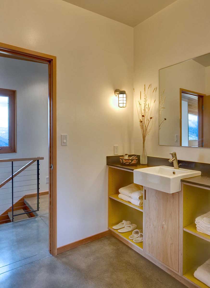 This two story dwelling is set into the hillside with concrete retaining walls that guide the form of the cabin. Its east west longitudinal axis and generous overhangs are designed to take advantage of solar orientation while maintaining panoramic views. The main entry is a two story room with full height glazing on the north and south walls that frame the most dramatic down-canyon view. An eastern oriented living space and kitchen occupy most of the main floor along with a powder room and utility area located within the hillside portion of the home. The upper floor contains the master suite and guest bedroom/bathroom with a loft style flex space that opens up to the living room below.