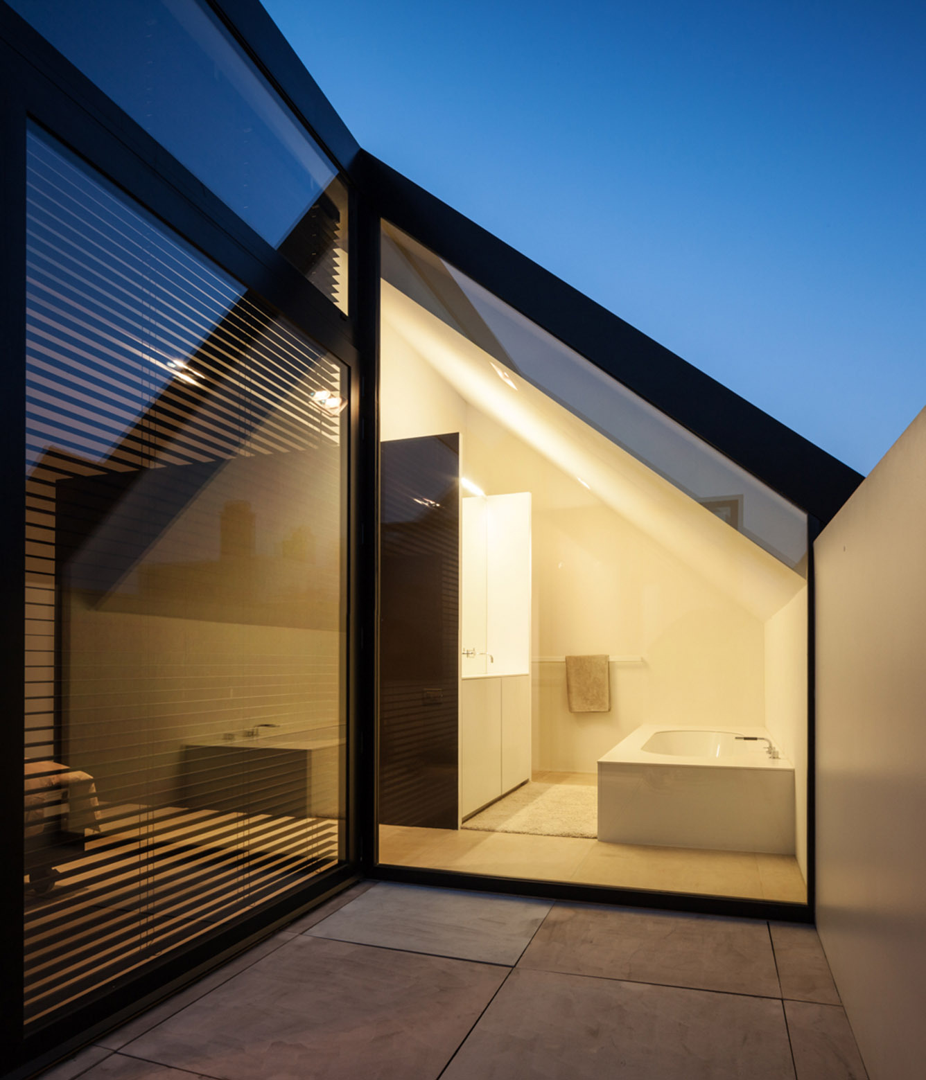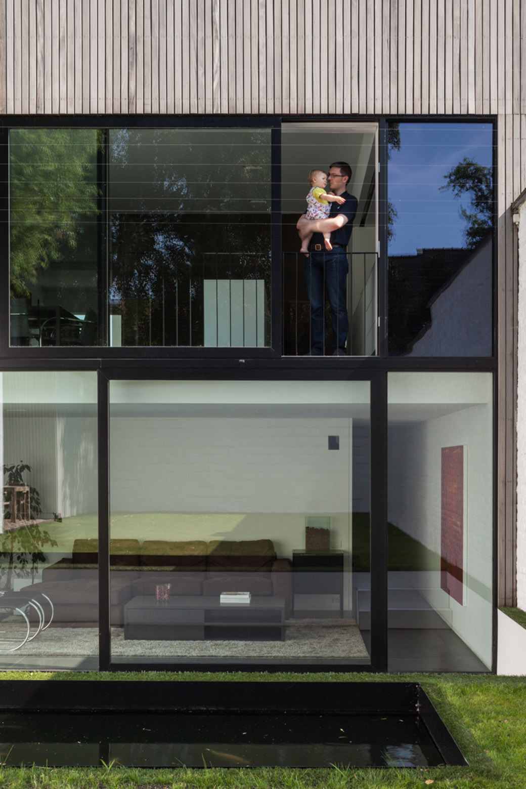 The front of the house was indeed adorned with wooden paneling made out of tropical hardwood, but the roof and the back of the house was also enveloped in the same material in order to create a balanced and harmonious look. The front window that faces the street was placed at an unusually elevated position in order to ensure utmost privacy. However, the rear of the abode features great transparency thanks to a series of large windows placed at the ground level and at the first floor. In order to efficiently blur the boundaries between the indoor and outdoor areas, the architect decided to place a terrace adjacent to the second floor bedroom, which means that the owner can always spend some time outside or even sleep outside by bringing the bed on the terrace.