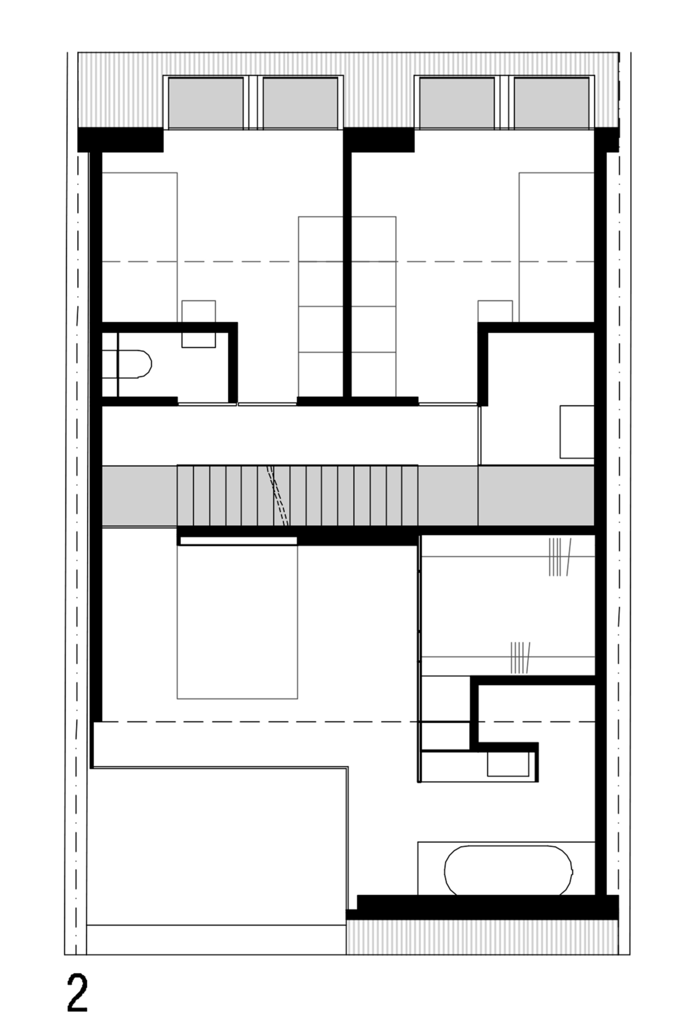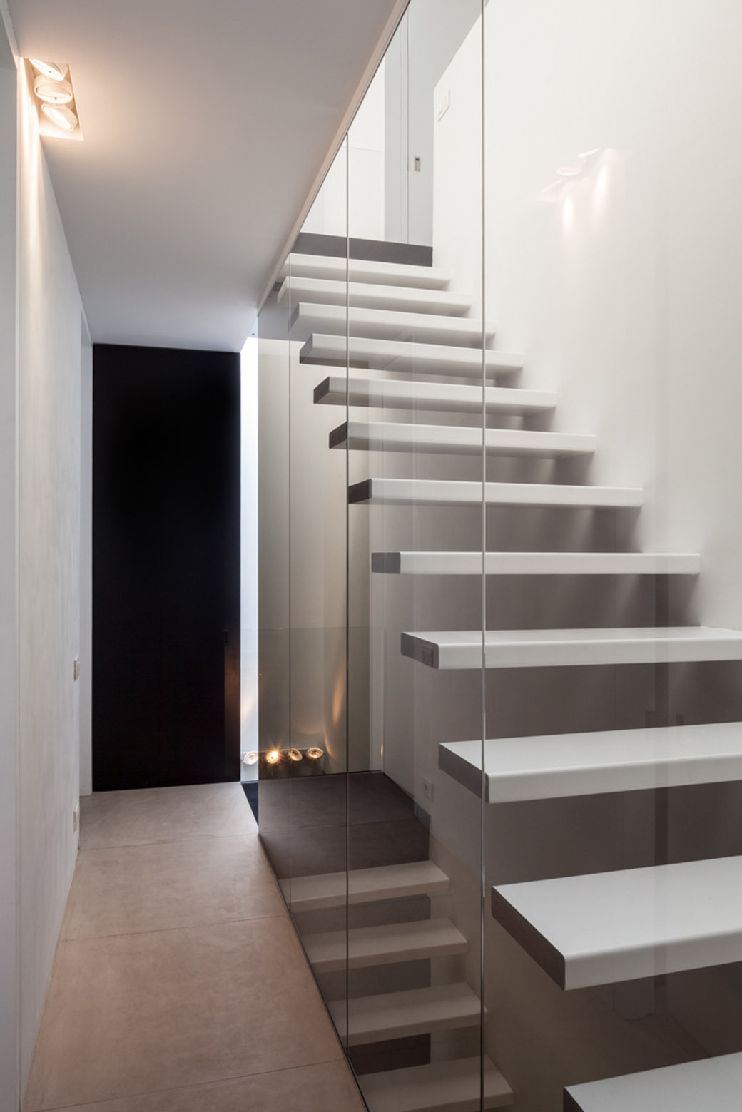 Interior highlights include a metal staircase that is bathed in natural light thanks to a light shaft.