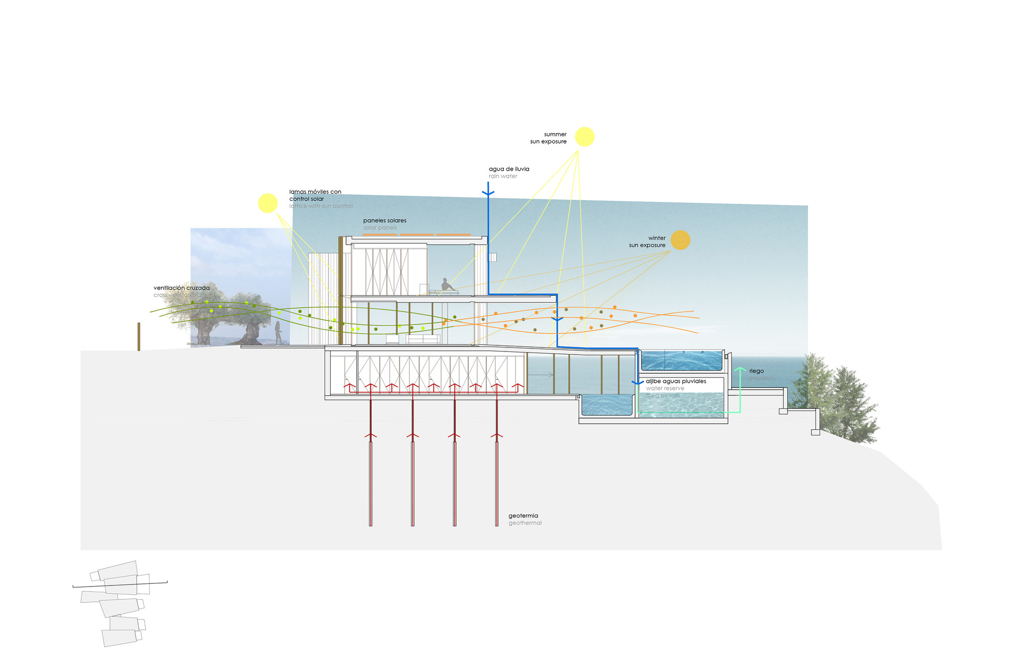 Under the outdoor swimming pool has been prepared an underground tank of 100,000 liters, where the rainwater is channeled subsequently for the use of irrigation. The groundcover vegetation of the garden is watered by exudation. The species used in the landscaping are native to providing a high level of integration in the environment and rational behavior of the species, with a consistent and controlled consumption of water resources.
