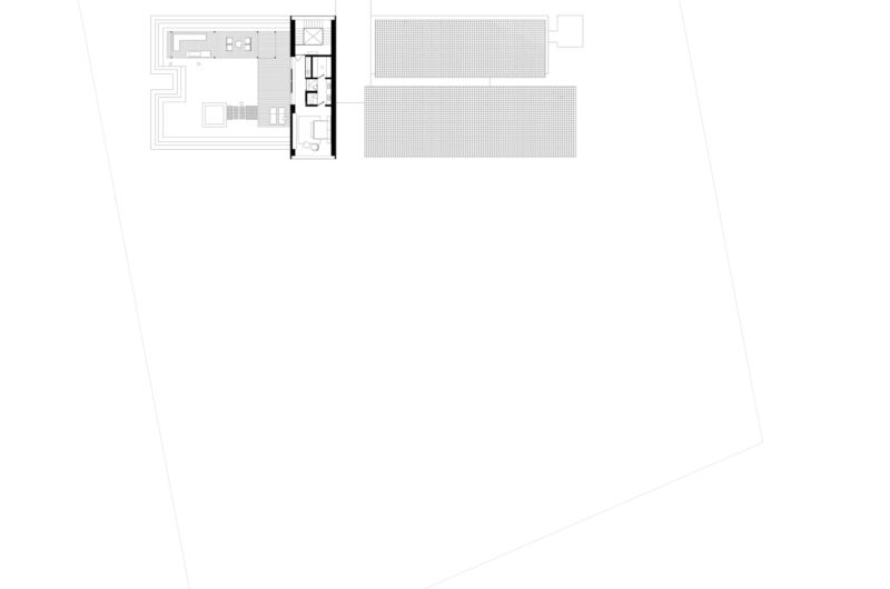 The program is divided into two distinct zones by the longitudinal passageway, as it follows: the southeast quadrant includes 3 bedrooms, each fitted with its own bathroom and a family room, while the southwest quadrant contains the service spaces, a stairway and the garage. The master suite, which is located on the second level, spreads out across both quadrants and leads to a spacious roof terrace.