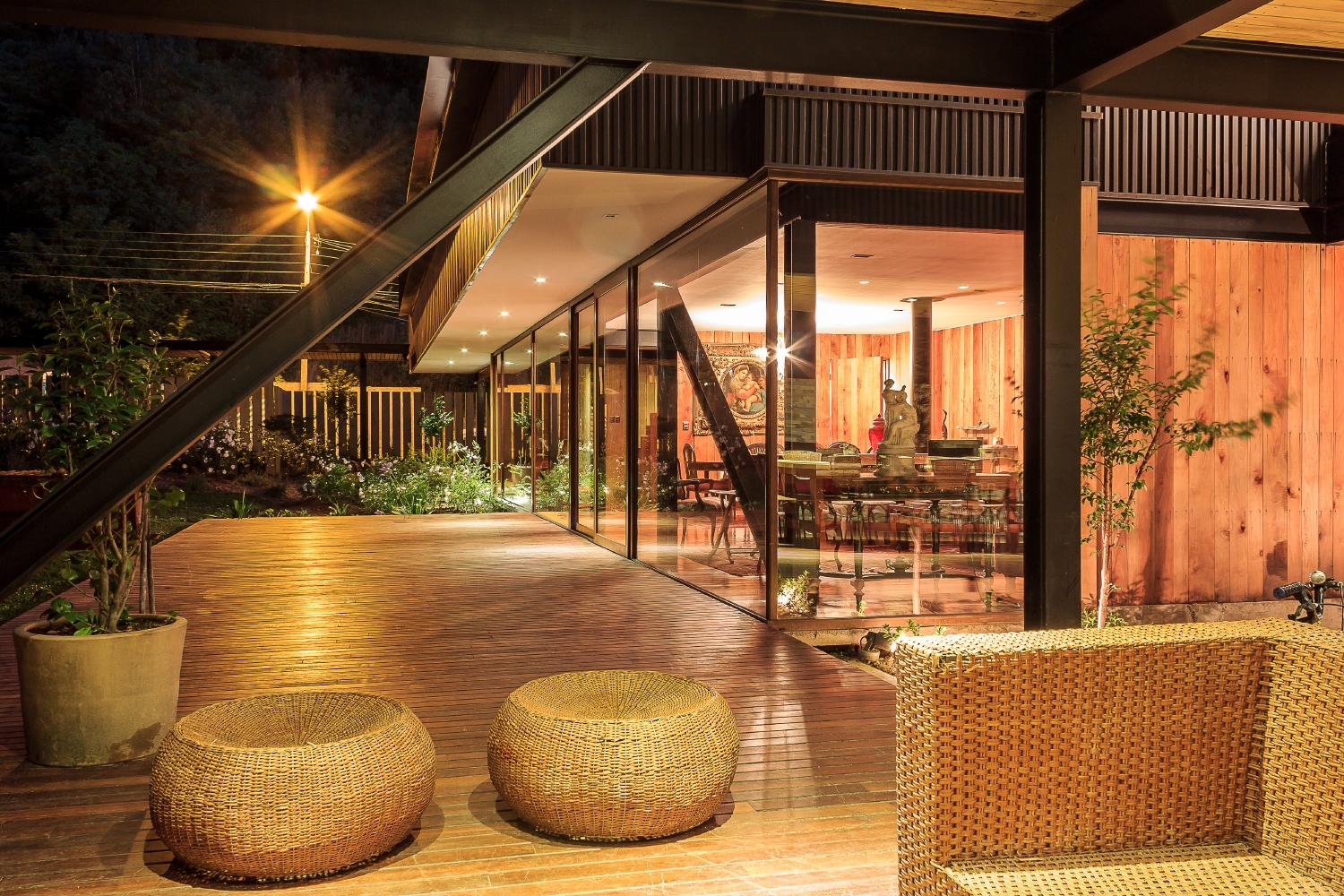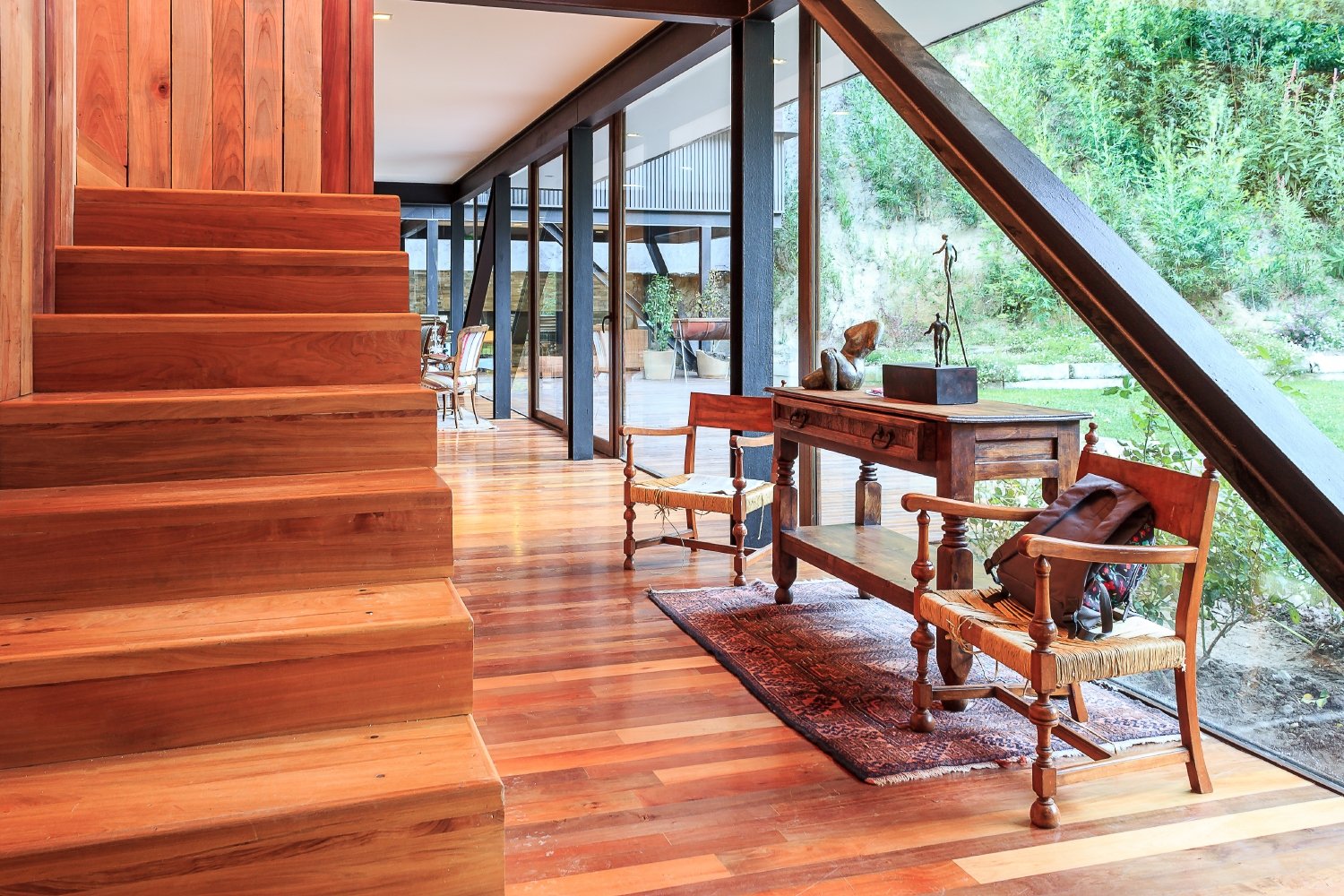 The glass box comprises the social spaces such as the dining room, living room, kitchen and barbecue area, while the upper platform includes the bedrooms. The second floor was made entirely out of wood and features horizontal windows with steel frames. Inside, we find a plethora of wood elements, including the furnishings, floors and the staircase that links the two levels.