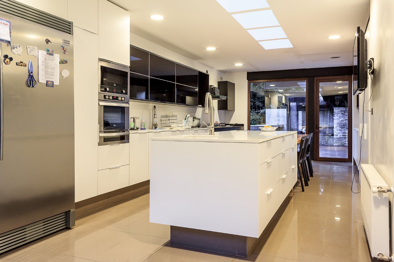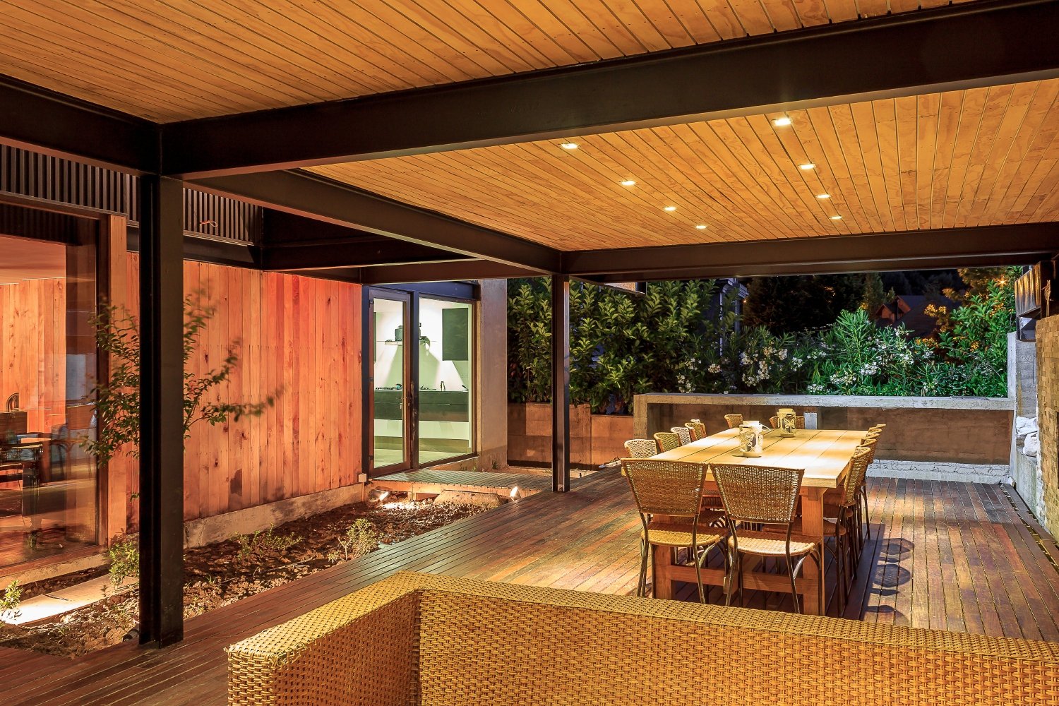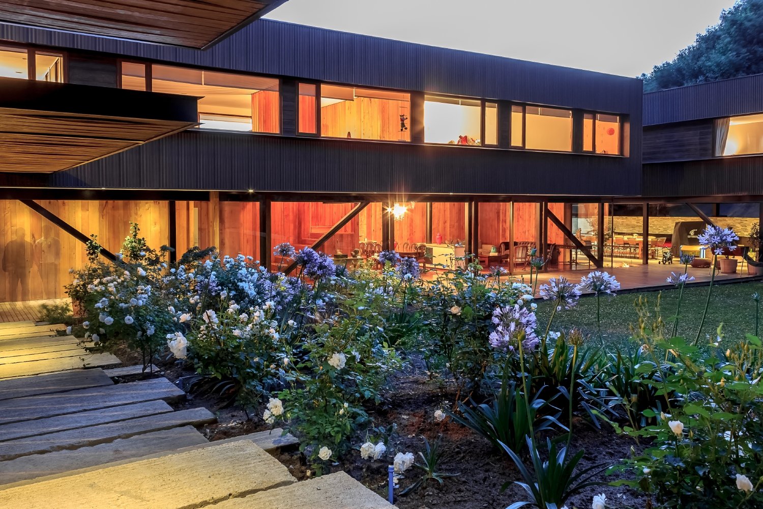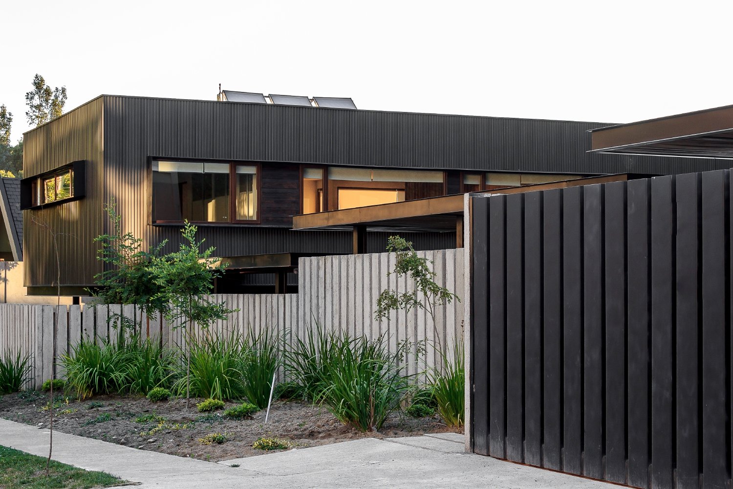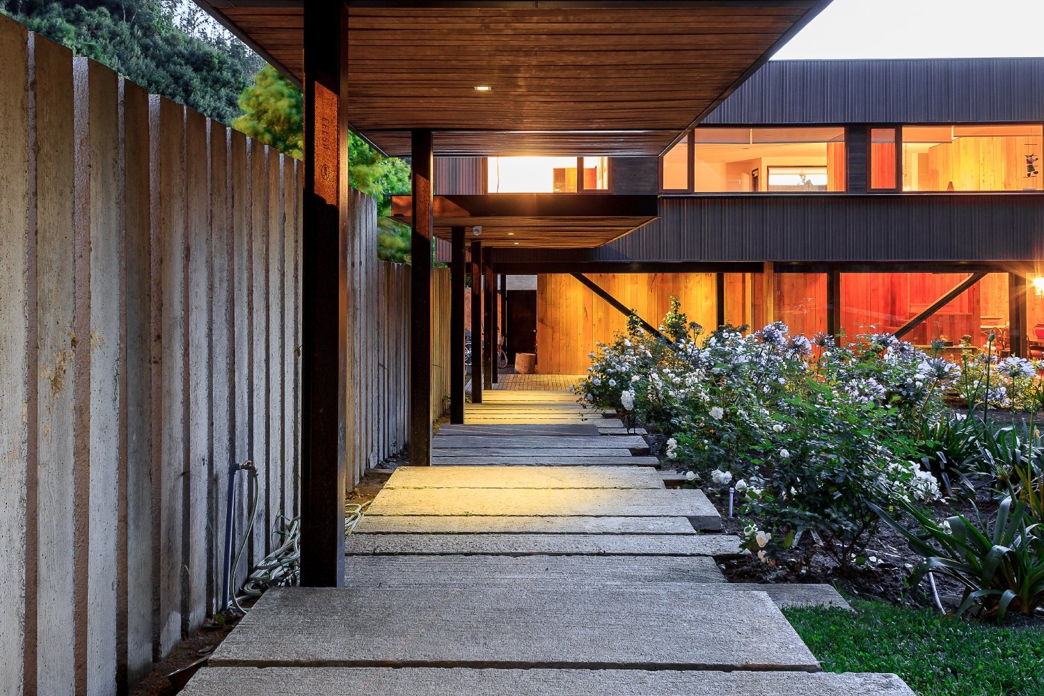 The horizontal fenestration, with long, transparent and continuous planes framed with steel plates like a visor, ratify the horizontal volumes that make up the house, like the parking and covered walkway to the house and the two wings of bedrooms, all trying to break free of the anchorage of the ground, looking for an expression of lightness, which does not touch the hill or the site.