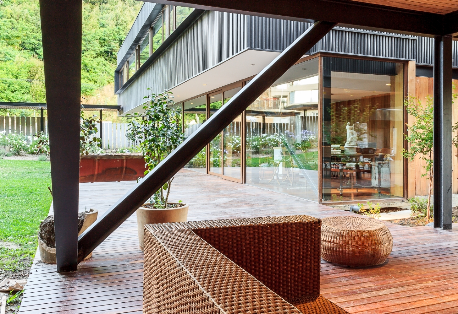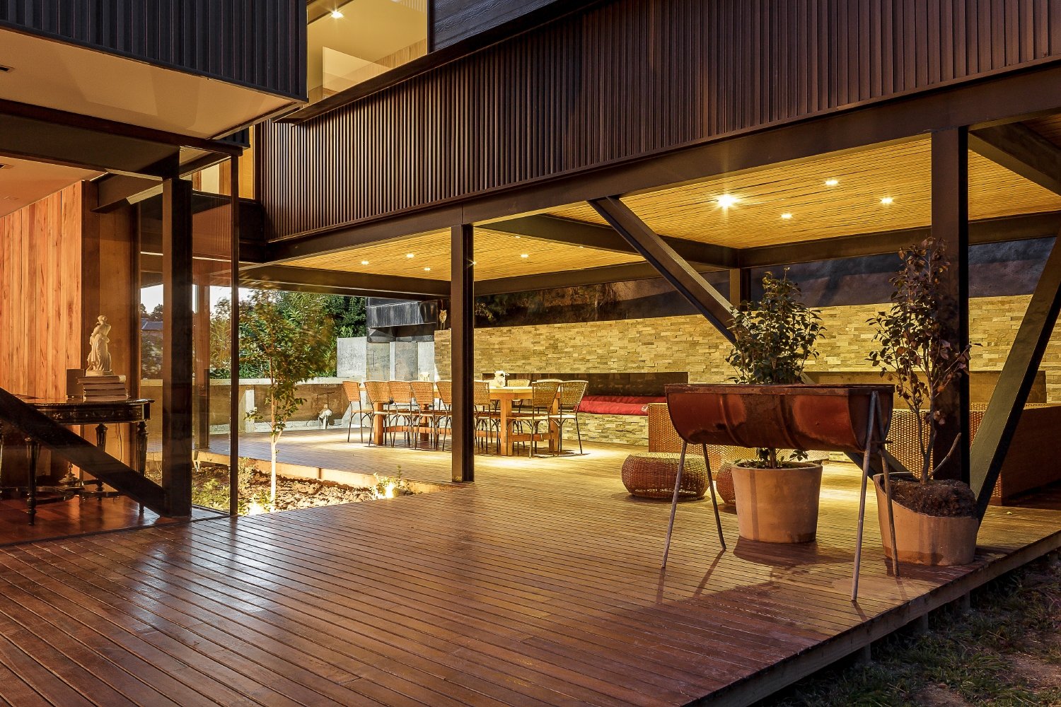The idea was to create a sort of series of columns made of small steel profiles, and a glass enclosure to contain the social areas; living room, dining room, barbecue and kitchen on the first level, maintaining a close relationship between the exterior and interior space, plus supporting with minimal materiality (steel and glass) the platform for the upper level that houses the private premises as living room and bedrooms.