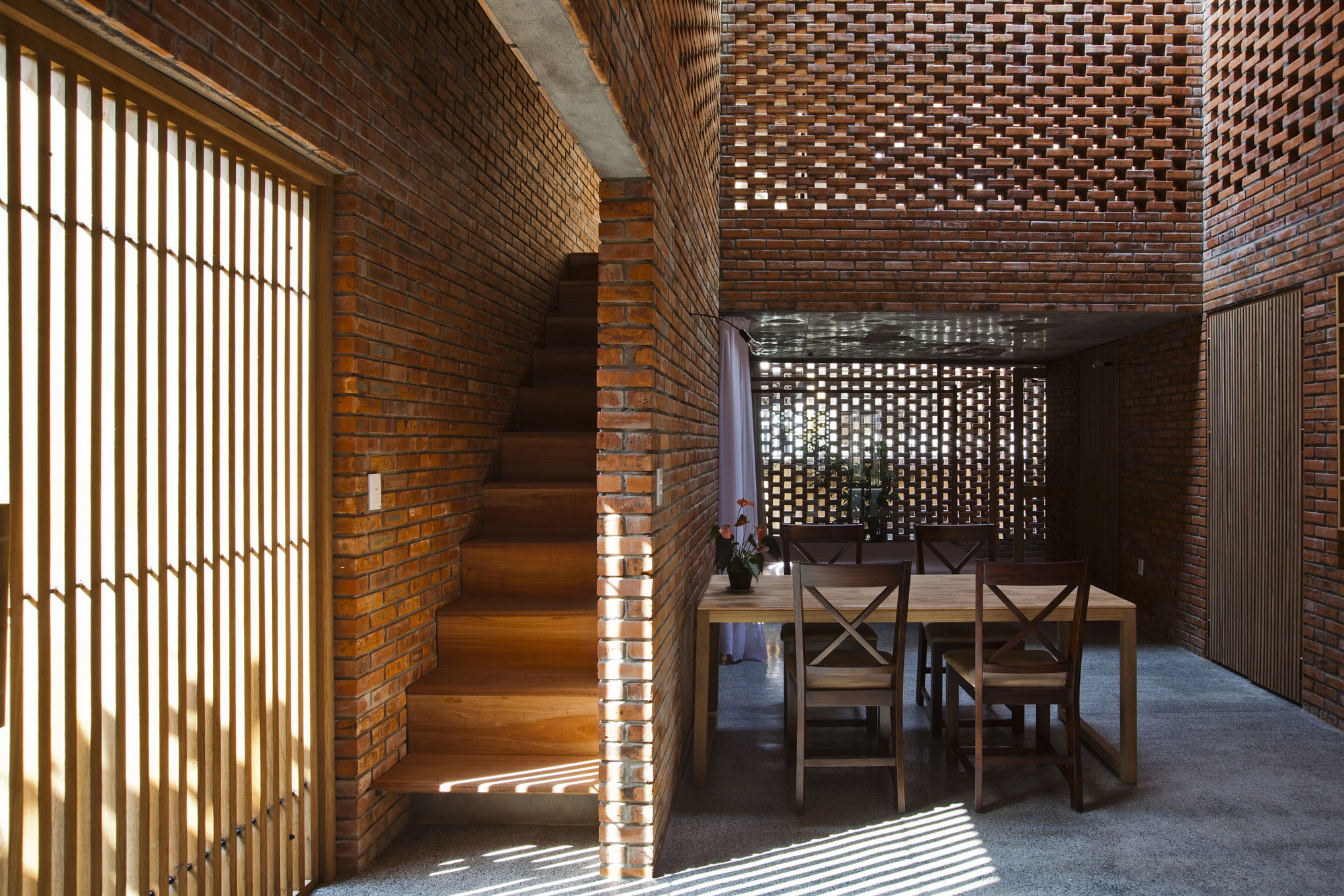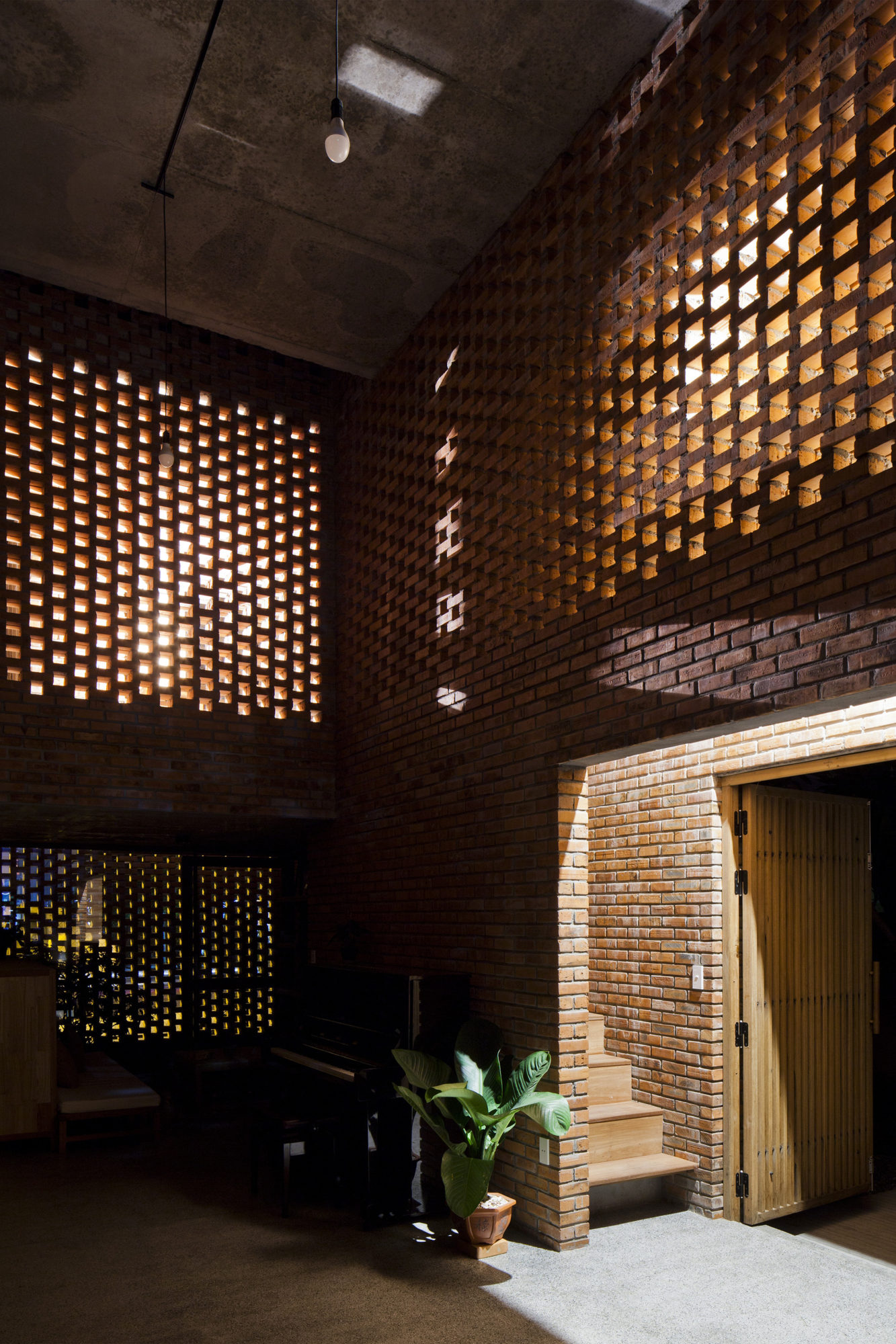 At different times during the day, the variety of the light intensity getting through the inter-floor holes makes the brick wall colors change from the light red in the morning, red at noon, dark red in the afternoon and more purple in the late afternoon and early evening. In the evening and at night, the house looks like a giant lantern with lights here and there from the holes. The surrounding brick walls are decorated with some rough bricks to make shadows. This improve the beauty and charm of every single samel-brick regarding its own shape and color.