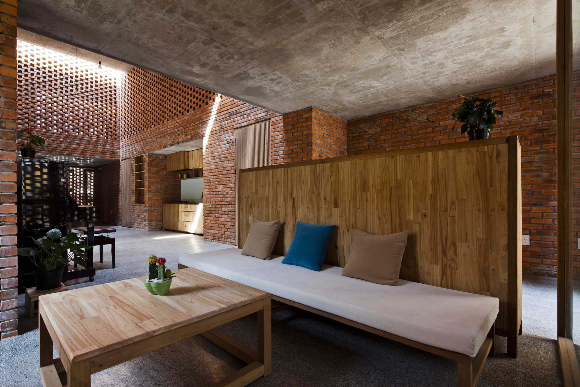 The house is mainly built with baked bricks which are also a traditional material in the local area. They are the very material to have been used for the construction of the mysterious ancient Champa towers. The ceilings are casted with original concrete, and the floors are covered with terrazzo in dark colors. All furniture is made with the timber from the roof of the old house, which helps make the total actual cost of the construction a significant saving (about under 22,000 usd)