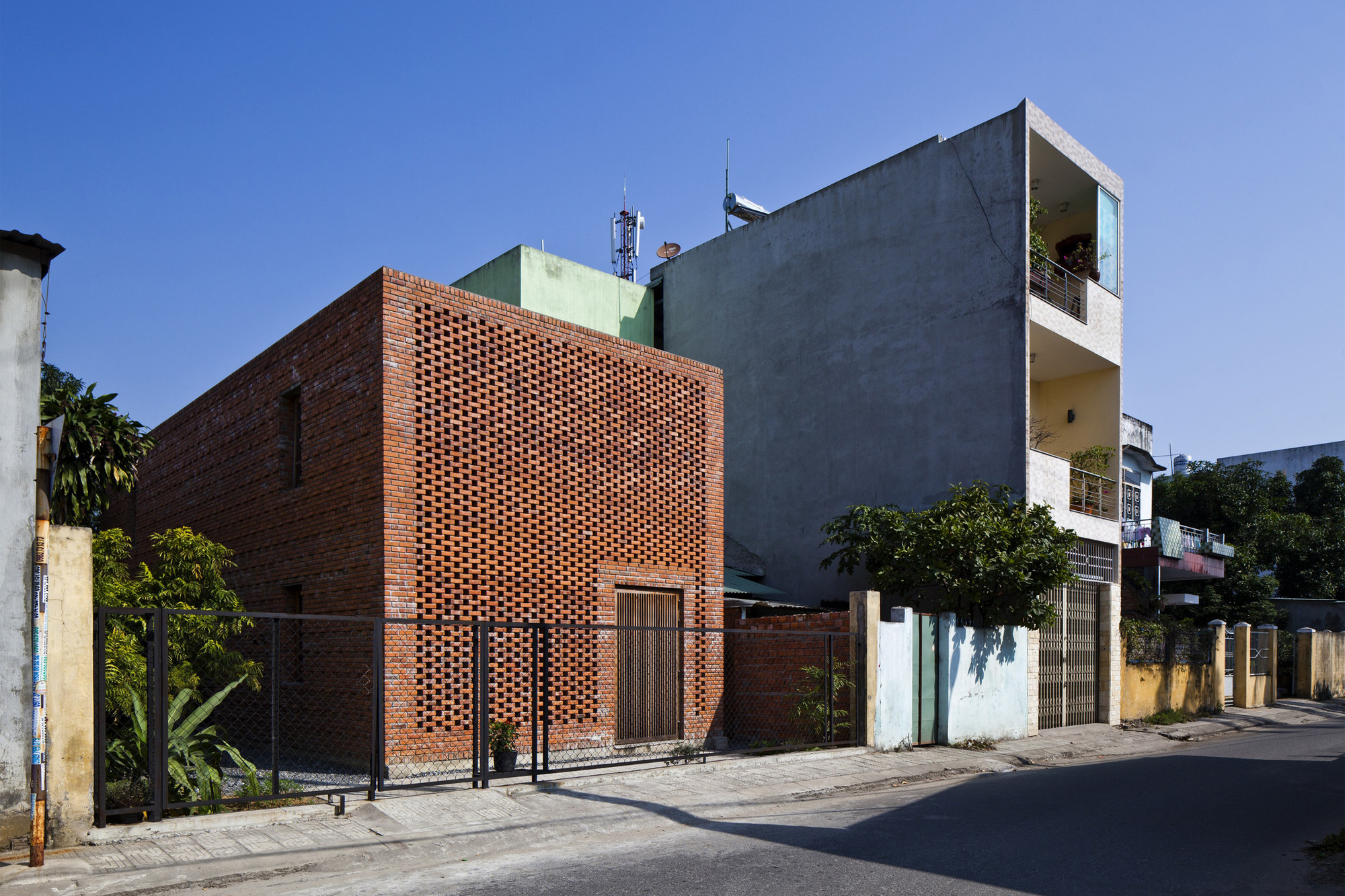 The special design of the baked-brick walls with a lot of holes, together with the large inter-floor space, allows breeze and light to get to all the corners of the house, even the hardest-to-access areas. The house owners are also able to enjoy the blue sky during the daytime or the moonlight night-time from the living room, the dining table or the kitchen.