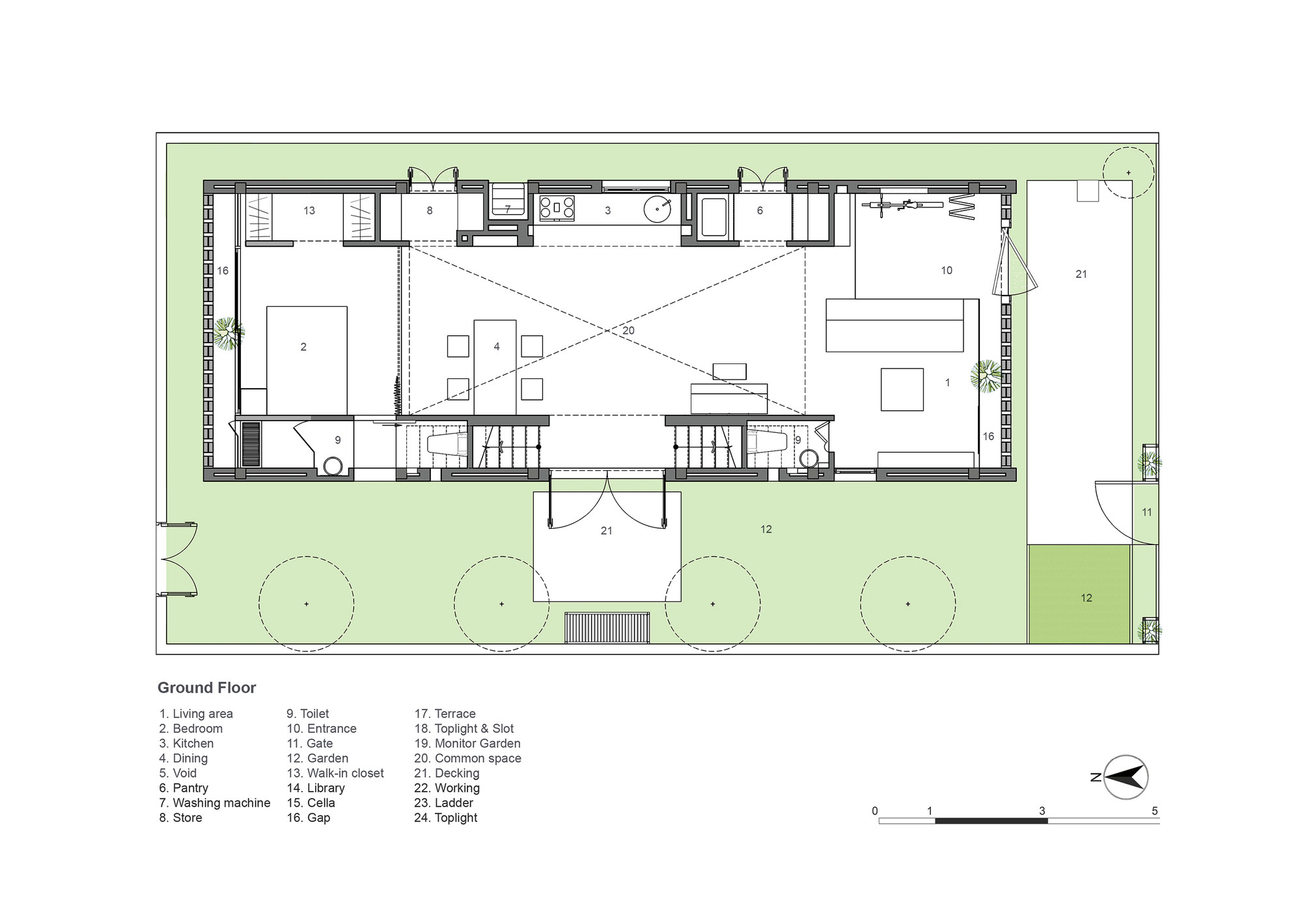 That the walls are entirely built with baked bricks makes the house cool in the summer; for this kind of bricks can function as a certain factor to keep the humidity for the entire house. The special constructing technique of “double skins” with two layers of one brick wall covering outside and one glass-aluminum frame inside creates a space within a wall, which functions as a buffer layer at both gables.