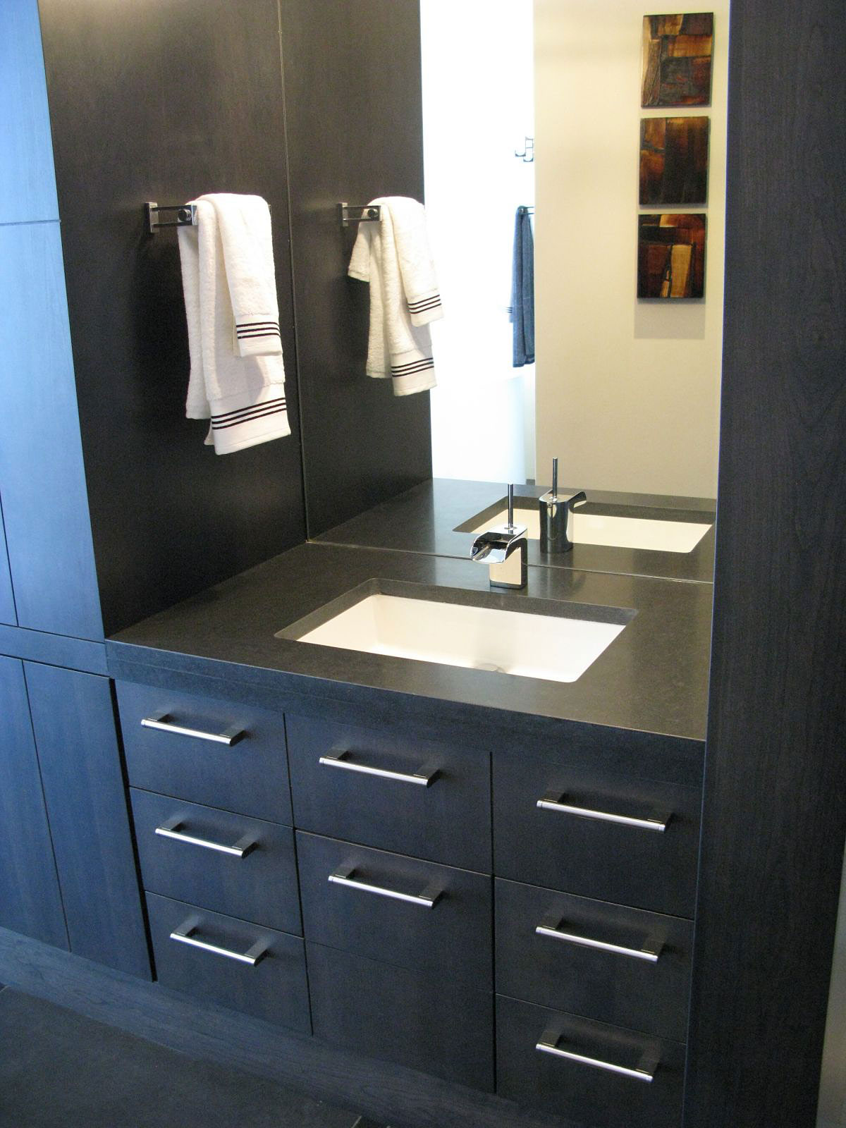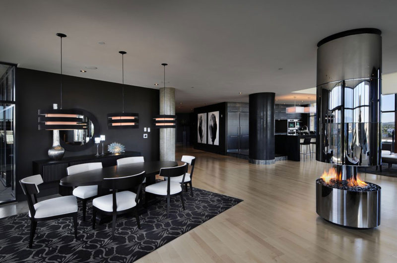 Luxe finishes give this home an air of sophistication, while also working as perfect backdrops for all the fine furniture that can be found throughout the entire place. The designers used granite for the floors, honed granite for the counter tops, custom hand-burnished plaster finishes in the Powder Room and on the large column, mirror-polished stainless steel for the 360° fireplace, stainless steel appliances, and anthracite stained millwork in the kitchen.
