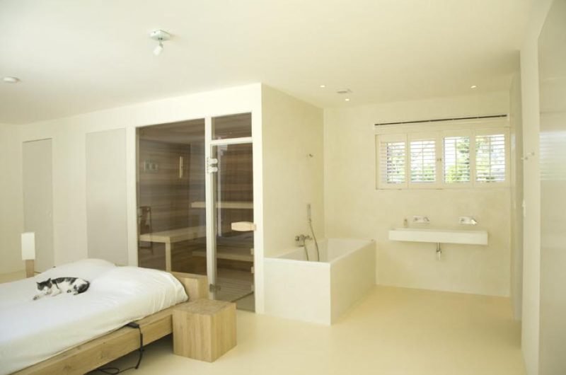 The villa’s eco qualities include extra insulated walls and roof, a cleverly-designed roof to facilitate rainwater collection, 20 solar panels for electricity, and a heat pump that balances the temperature of the house from deep into the ground.