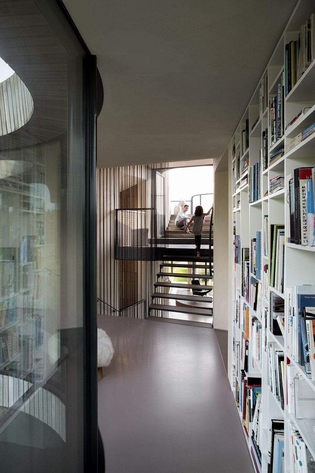 The organisation of the house is defined by its external conditions. The more intimate working and sleeping areas are located towards the back, where the enclosure of the nearby woods provides an intimate, private setting, while the living areas enjoy expansive and panoramic views of the polder landscape to the front.