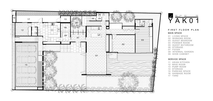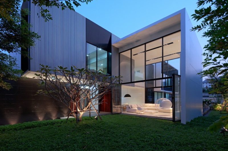 The YAK01 House is a modern construction located in Bangkok, Thailand that was designed by Ayutt and Associates Design. It features 560 sq. m of private land and 500 sq. m of usable internal space and it was specially created for a small modern family. Even though the space is limited, the owners wanted a home with sun shades, rain protections and a large greenery area for relaxation.