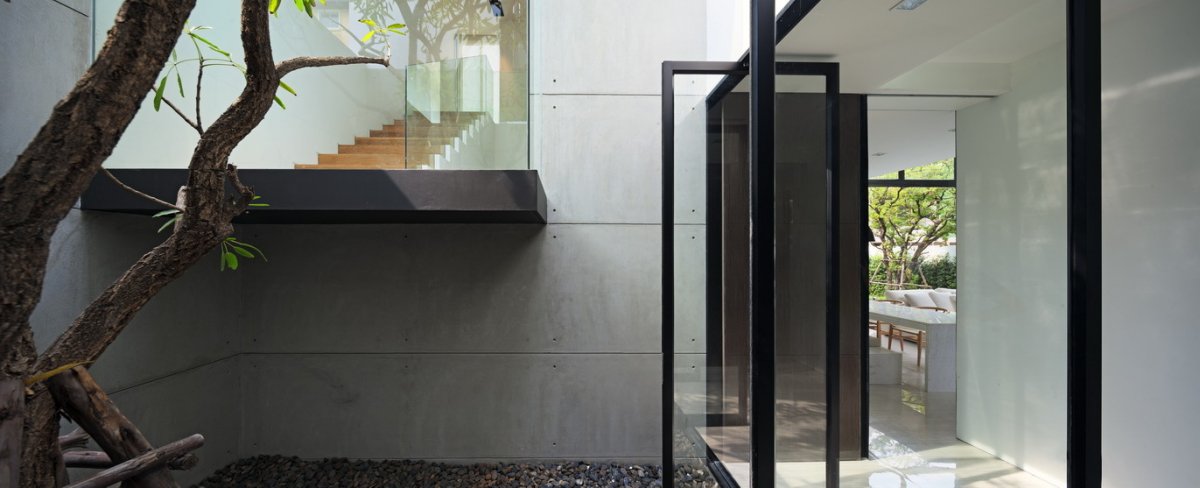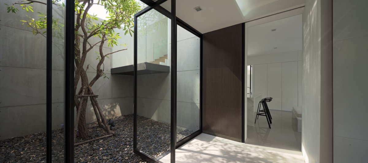 It’s an L-shaped house just because they wanted to increase the usable space and the green area. The north side of the house is covered with glass in order to receive natural sunlight because the northern sunlight is the least intense in Thailand.
