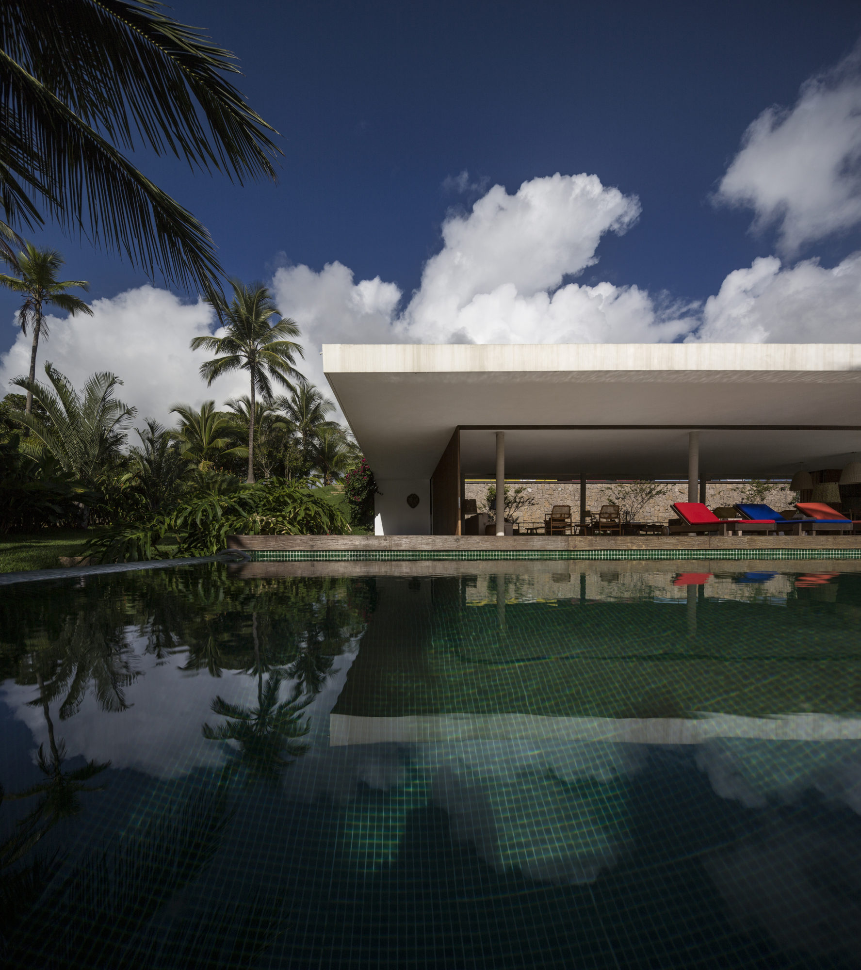 The House Txai offers a radical experience of integration between the inside and out. It is a place to drink coconut water, swaying in the hammocks. The tropical atmosphere of Bahia impregnates all of the spaces and the contact with the garden is necessary in order to use the house, as it integrates the trajectories of quotidian life.