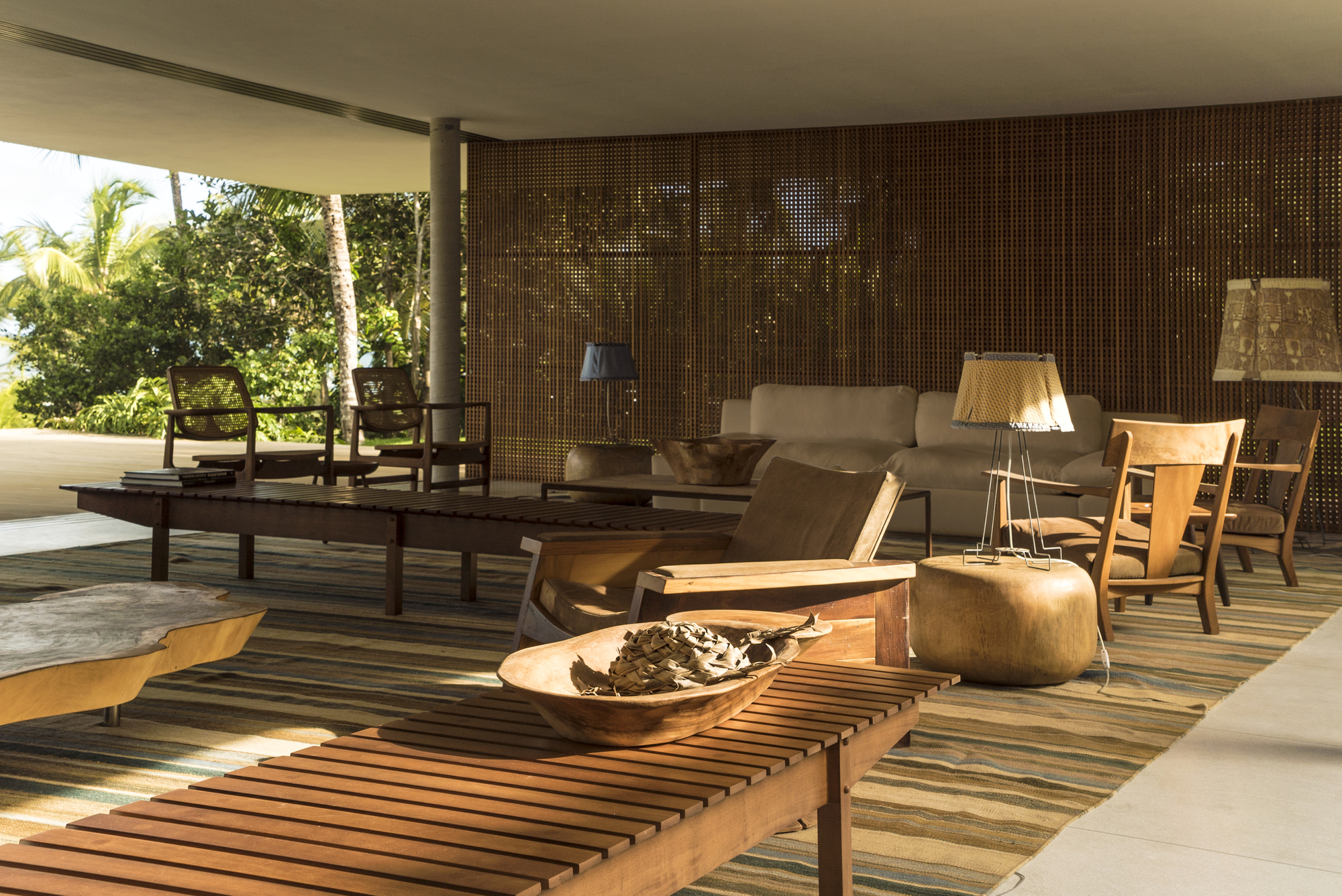 The bathrooms extend outside of the roof and are all opened to the outside, having their own individual gardens defined by walls, like patios. The doors in front of the rooms look out to a generous 2.5m-wide veranda where the hammocks rest on the recycled wood roof. The mashrabiya doors – a wooden latticed element, traditional in modern and colonial Brazilian architecture – shade the interior of the bedrooms, allowing the breeze to pass; and they can remain completely open for complete control of the interior light.