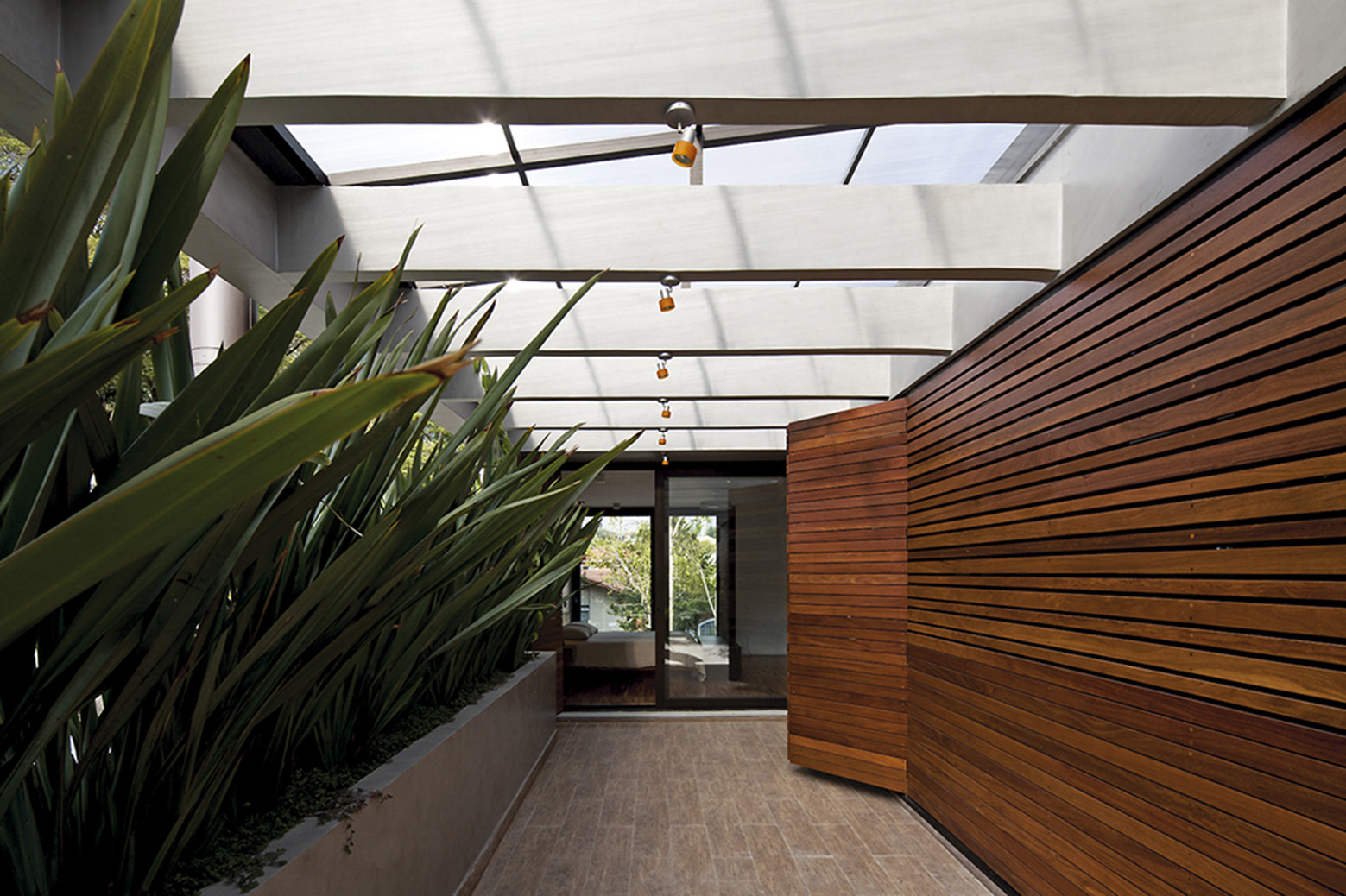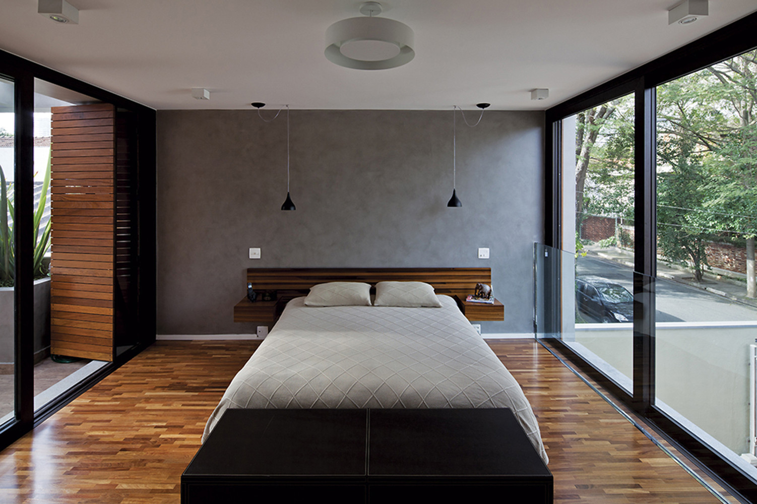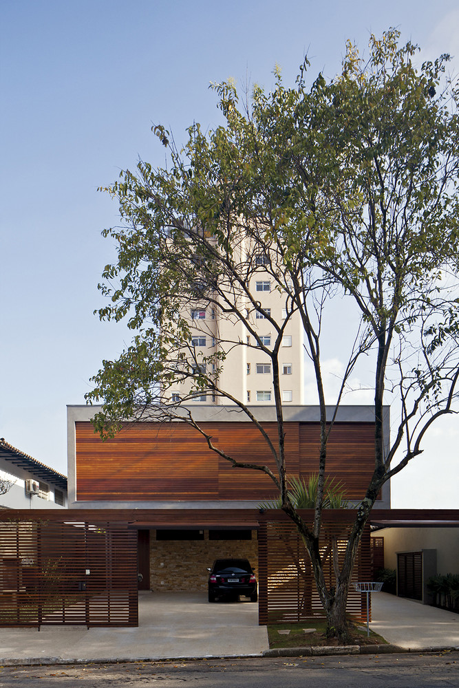 A walkway, protected by a glass railing, leads to the suites, passing between one side of the stairway and the intimate room. At the façade, the horizontalness is enhanced by the generous cumaru sliding window, which protects the glazed openings. In order to avoid the tall claustrophobic walls, common in big cities, the solution was a wooden strips gate.