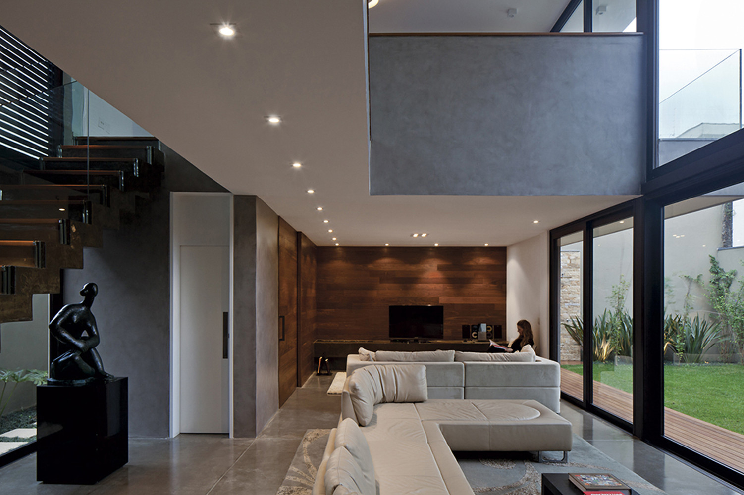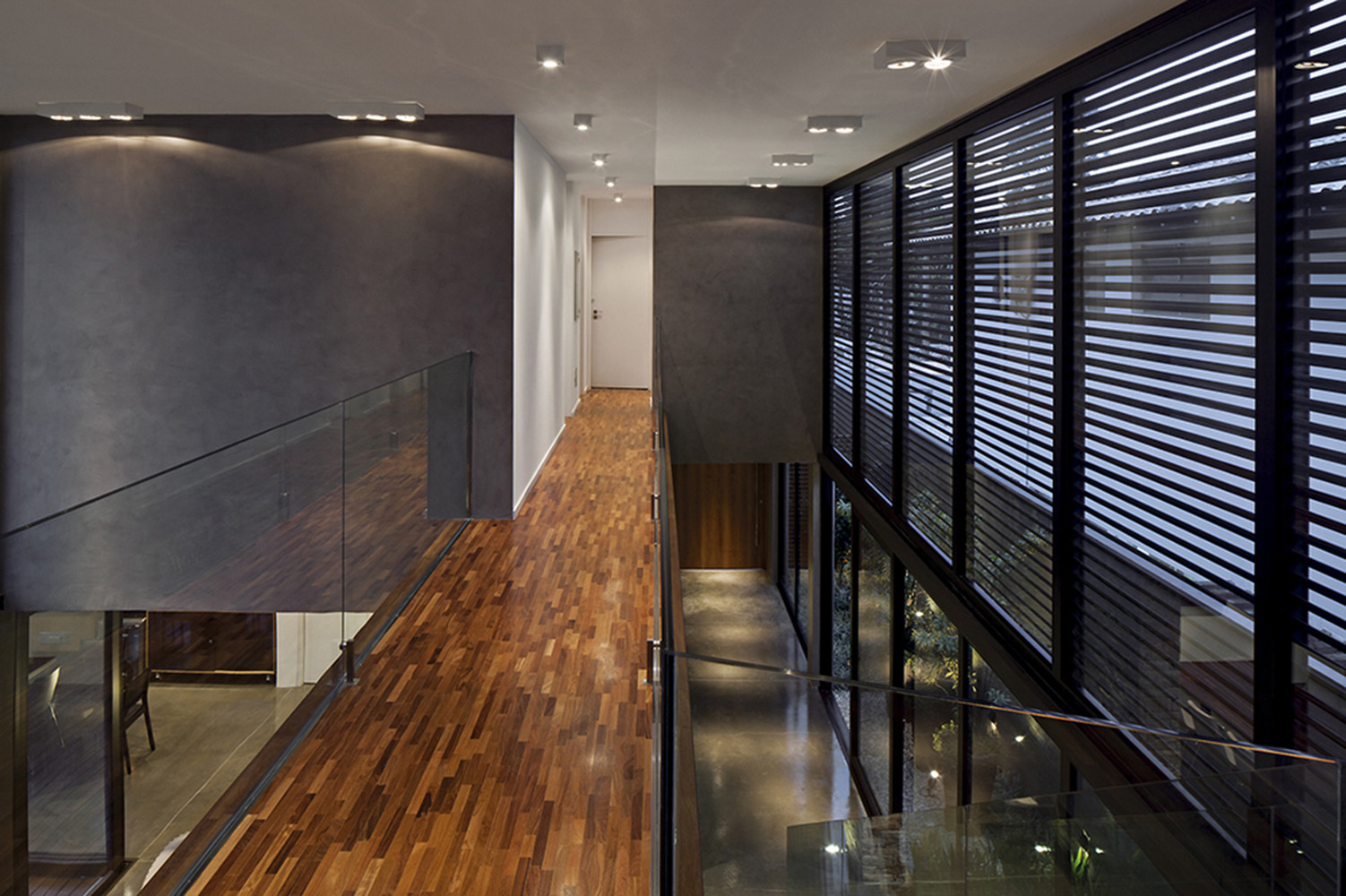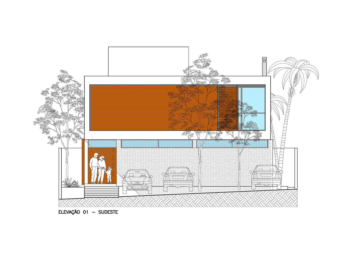 A walkway, protected by a glass railing, leads to the suites, passing between one side of the stairway and the intimate room. At the façade, the horizontalness is enhanced by the generous cumaru sliding window, which protects the glazed openings. In order to avoid the tall claustrophobic walls, common in big cities, the solution was a wooden strips gate.