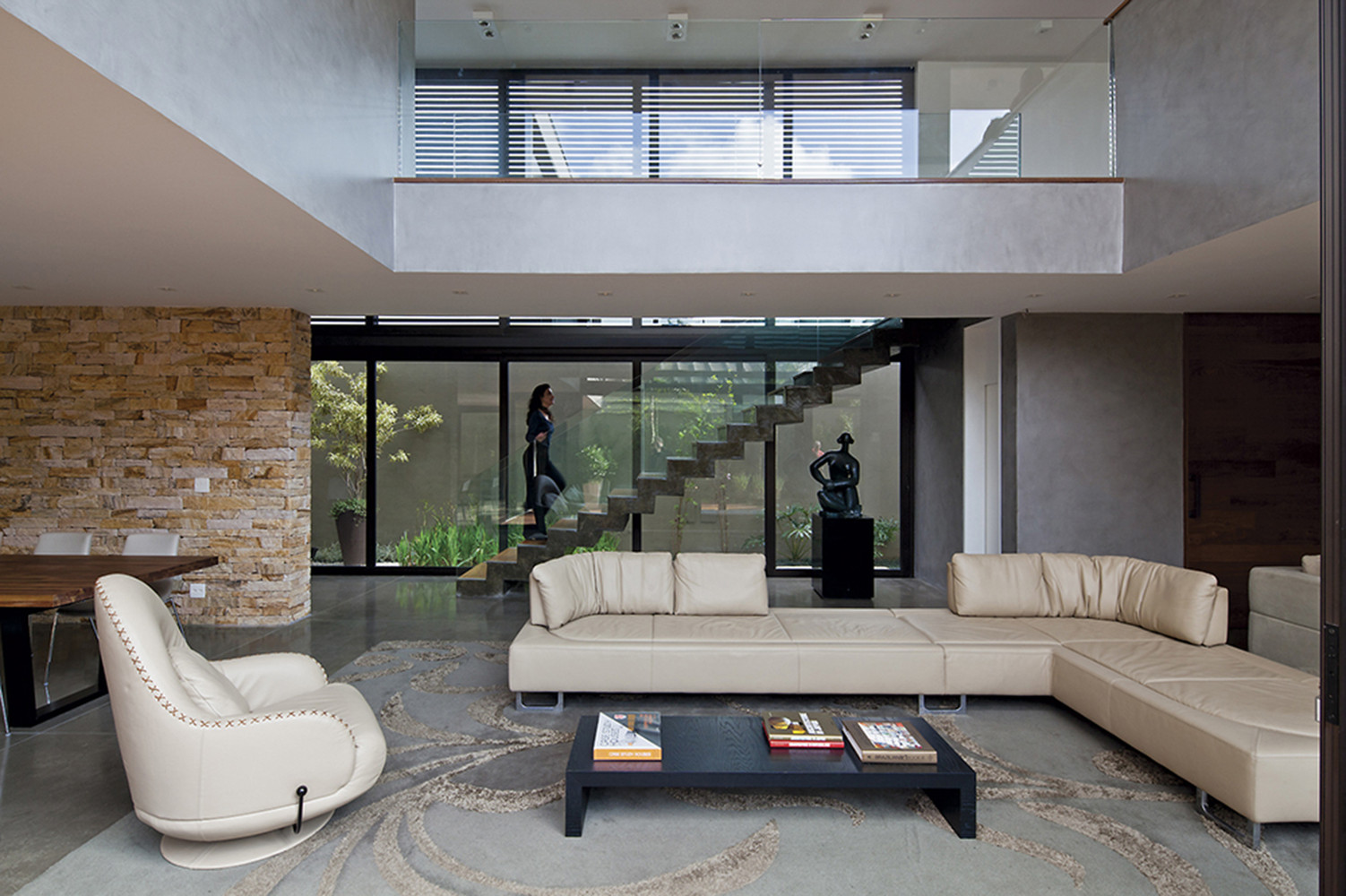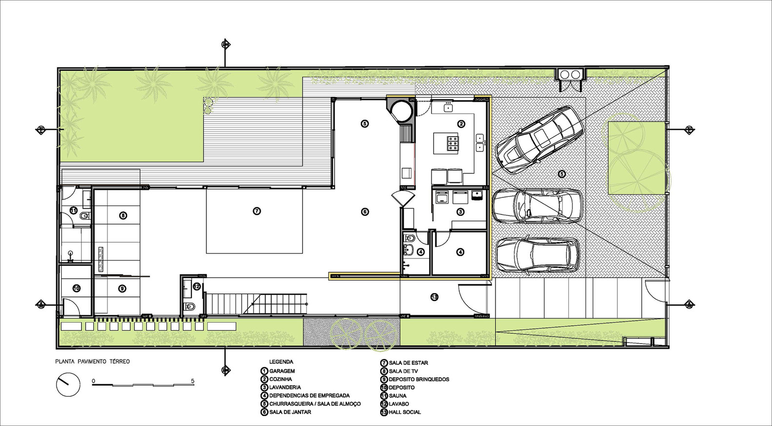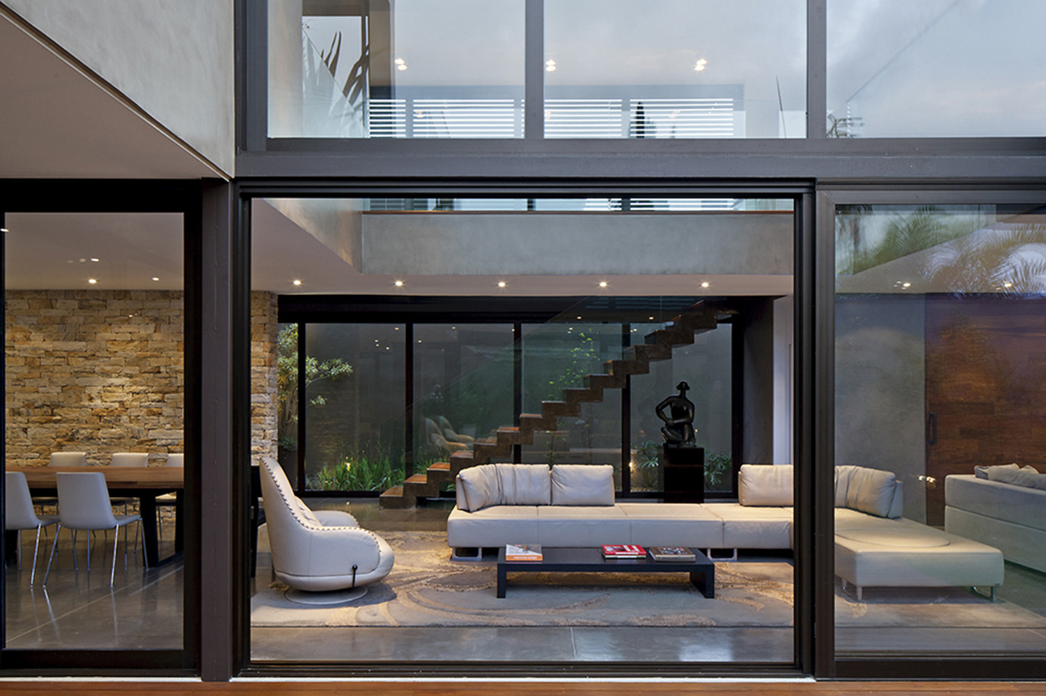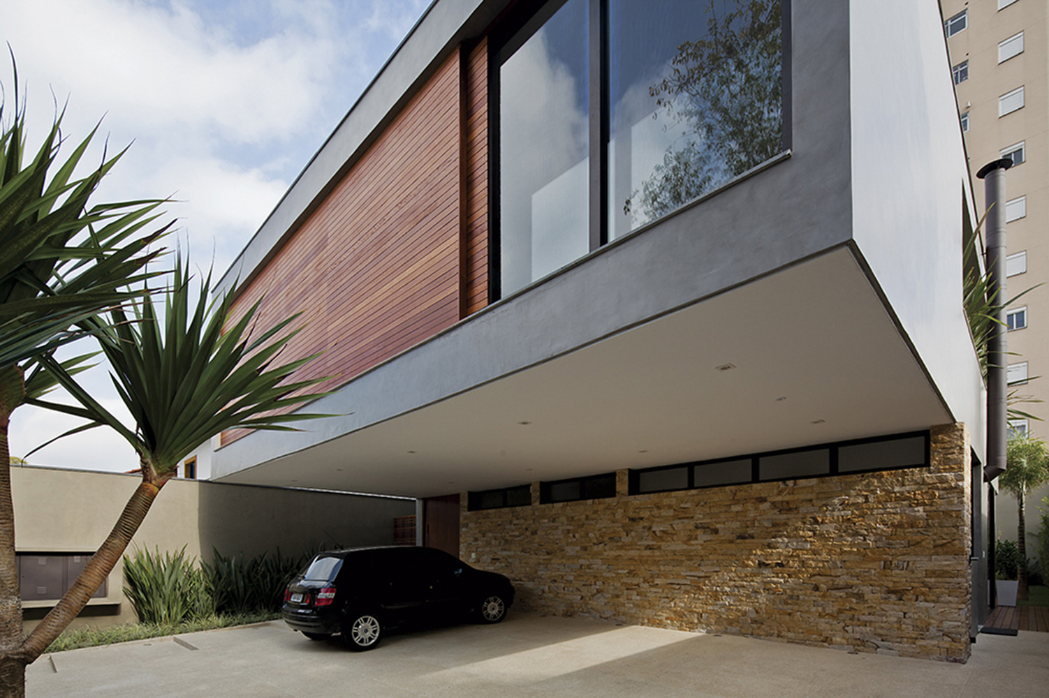 The project occupies the whole lot. The sides have gardens, and the home faces the greenery, making the distinction between interior and exterior very slight. The large glass frames with double high ceiling open to the two sides of the house, one of them protected by brises, allowing good natural lighting, in spite of the building at the back. At the top floor, the three suites are integrated through a veranda covered with a pergola and glass. This clear and pleasant space, besides providing the necessary privacy for the bedrooms in relation to the neighboring building, is useful for the children, who can play there safely.