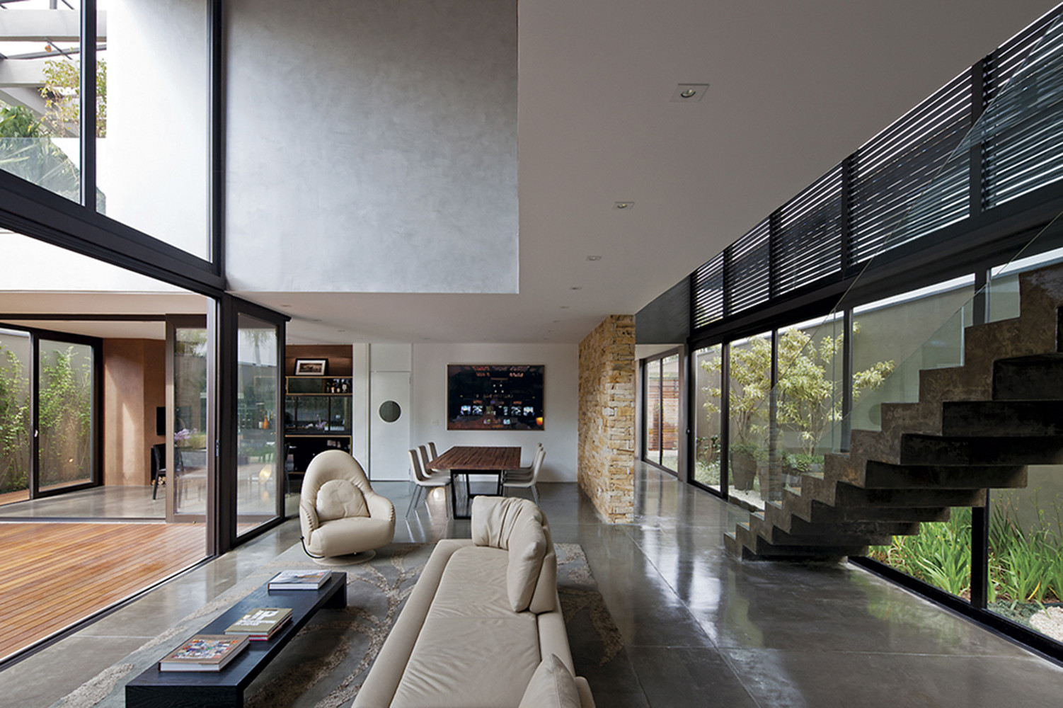 Creating disguised transparency ambiances such as gardens, patios with pergolas, and openings partially protected by brises, Architecture has provided to tenants the desired sunlight, ventilation and privacy. Set in Vila Madalena, western district of São Paulo, a very intensively socially and culturally agitated region, this 400 m² residence was designed by architect Monica Drucker for a couple with three small children.