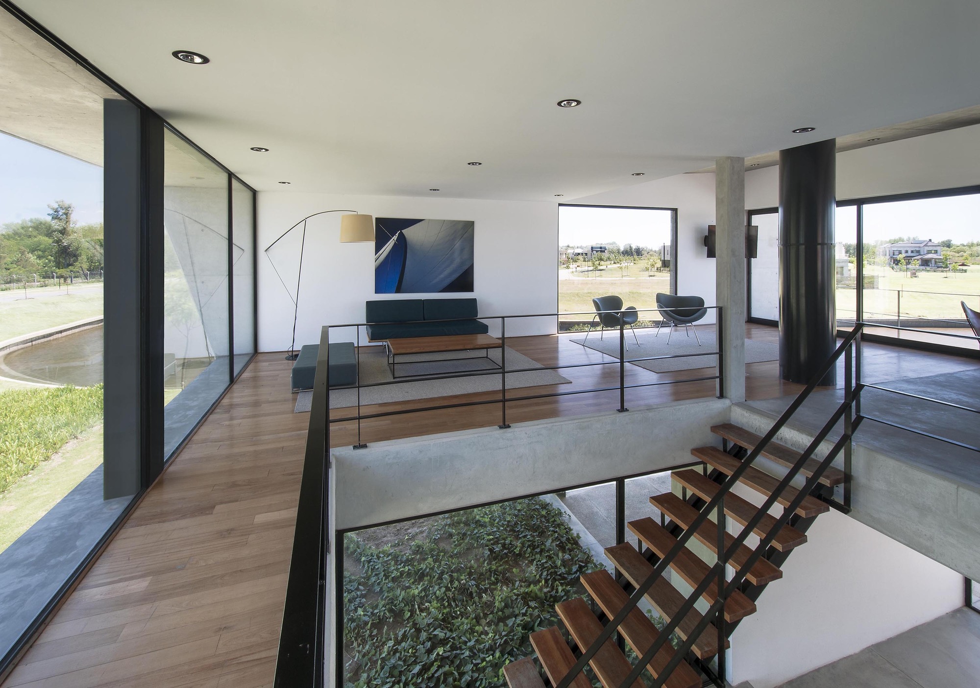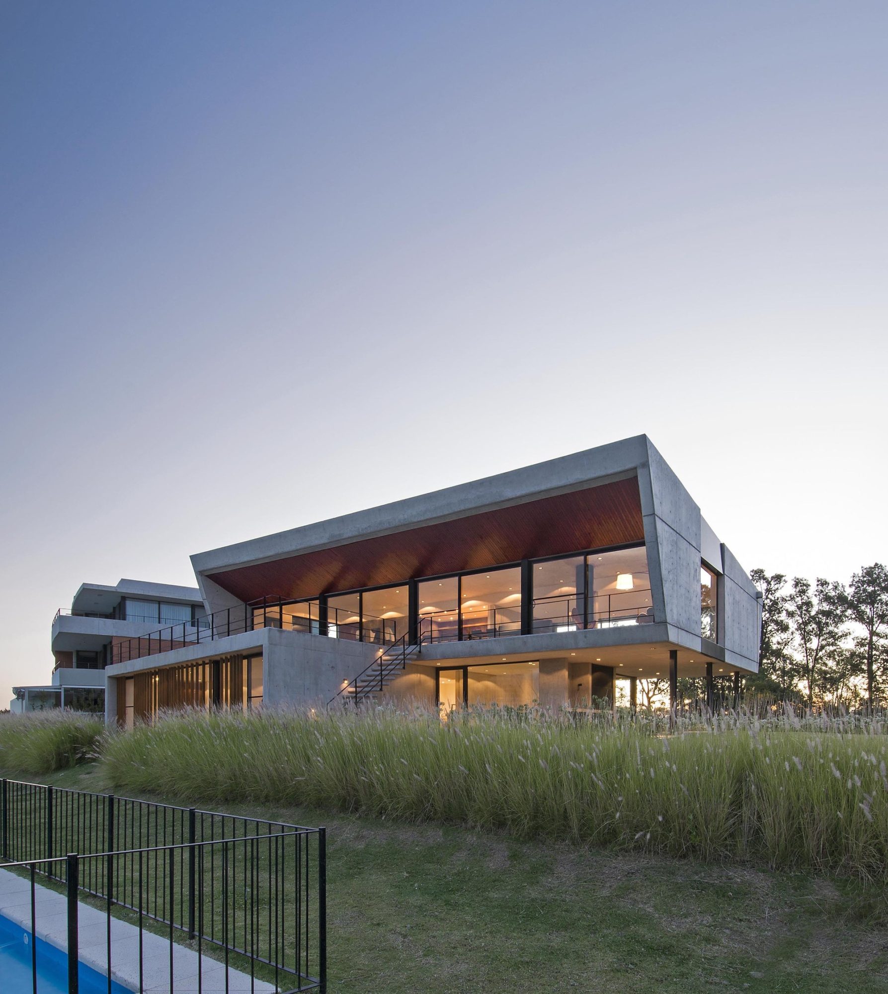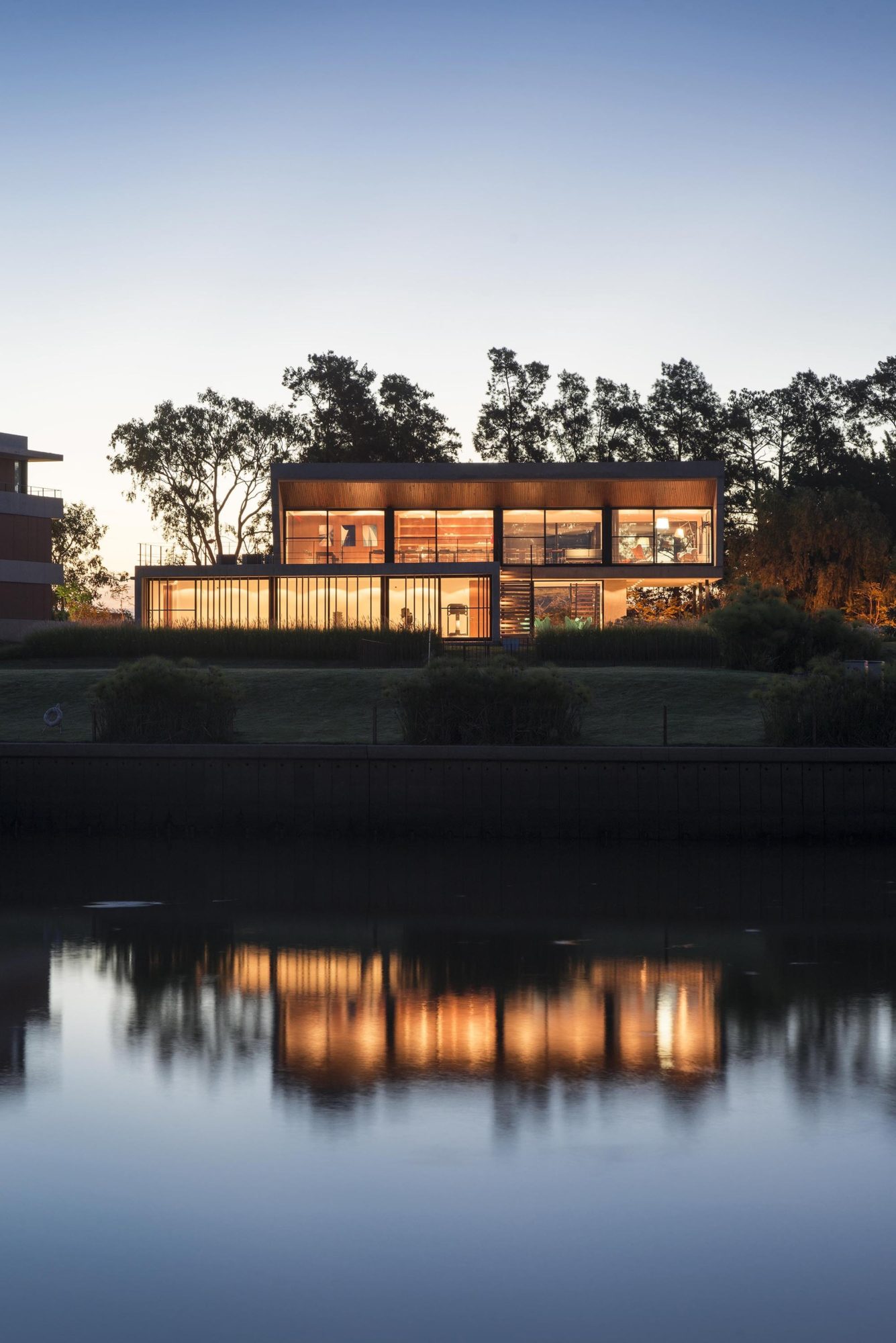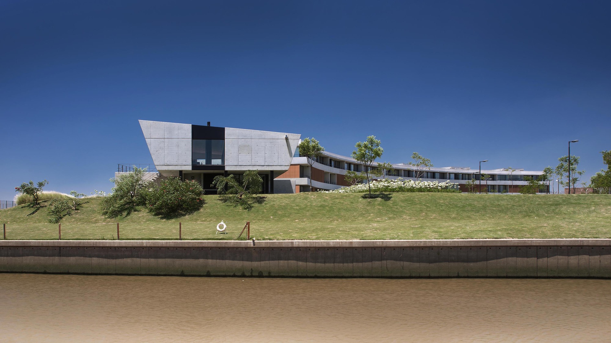 Flaunting a sturdy reinforced concrete structure, metallic solar shades and aluminum window frames, the Yacht Clubhouse was inspired in its design by the sail shapes of prestigious America’s Cup vintage ships. The project was sketched out by Estudio Ramos and completed in 2014 in Buenos Aires, Argentina for a local nautical neighborhood community.
