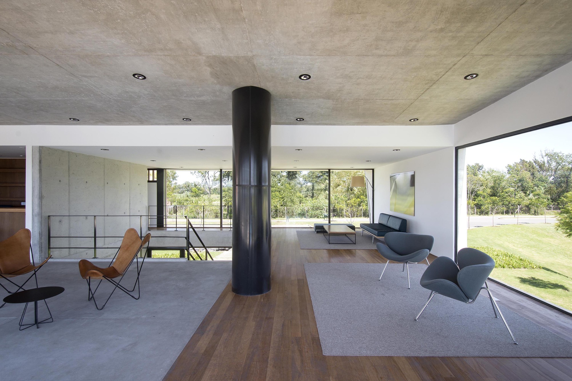The building’s structure is reinforced concrete, with exposed concrete facades, aluminum window frames and metallic solar shades. Low maintenance materials such as wood and concrete on floors and walls are also used in the interior of the building.