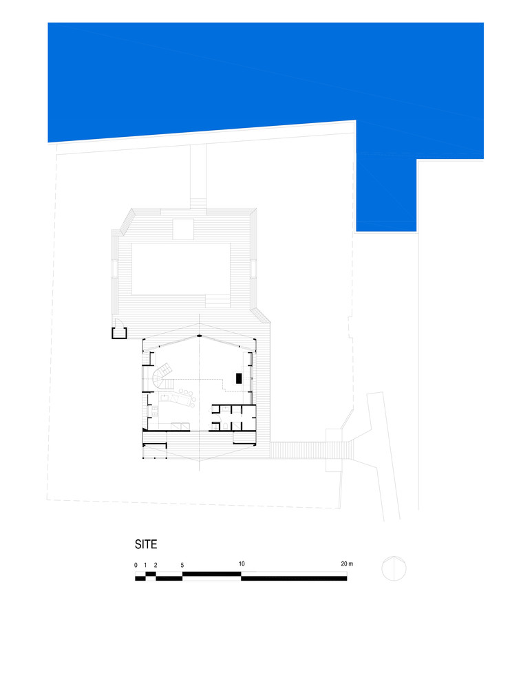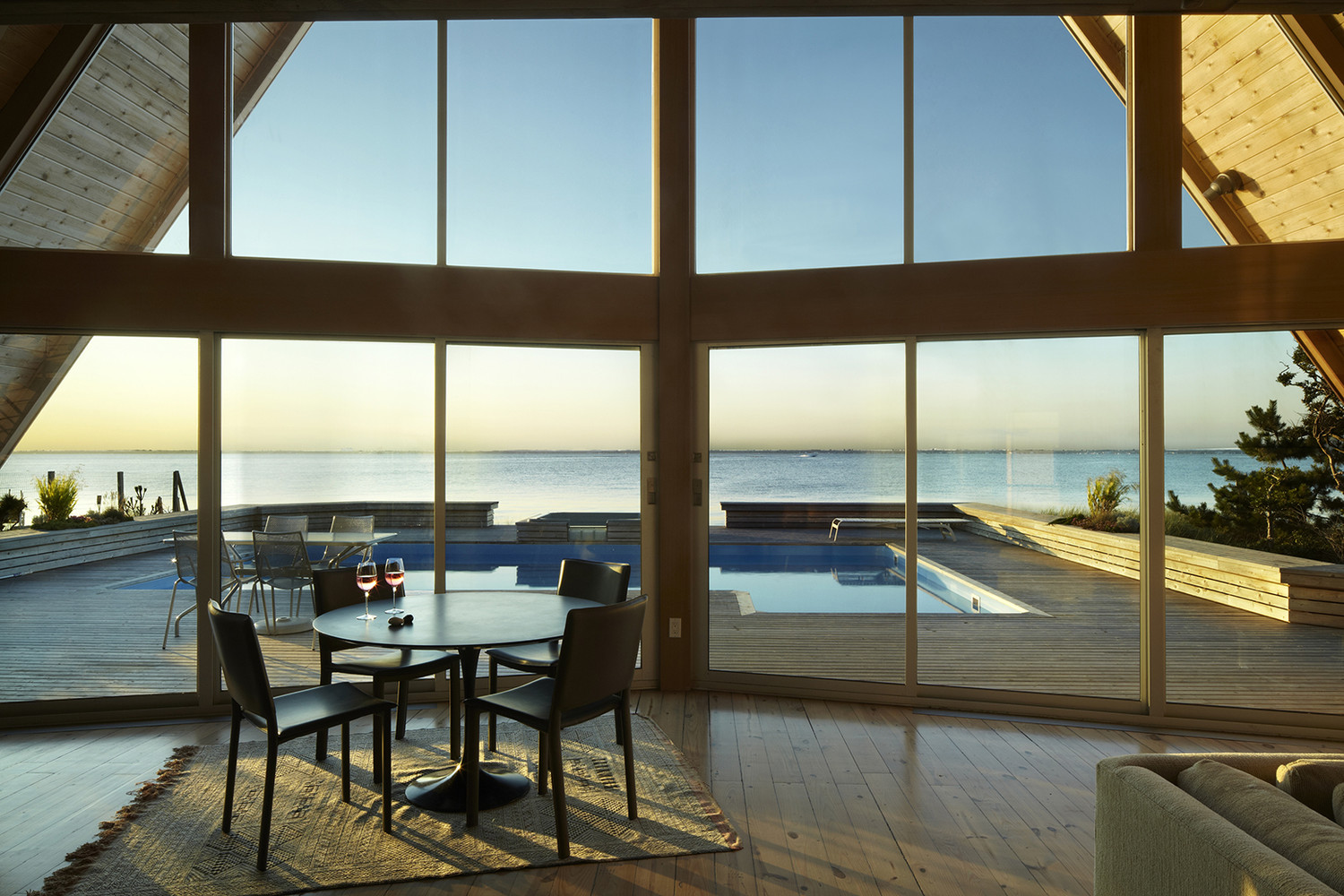 On a stunning site with panoramic water views and wonderful exposures to the changing light of the day stood a typical 1960’s, three story A-frame. The derelict structure had a tight spiral staircase splitting the middle, four dark bedrooms, a leaky roof and a cracked pile foundation. These were the conditions overcome in this dramatic, open, expansive, light-filled renovation in Fire Island, New York.
