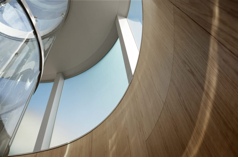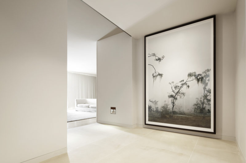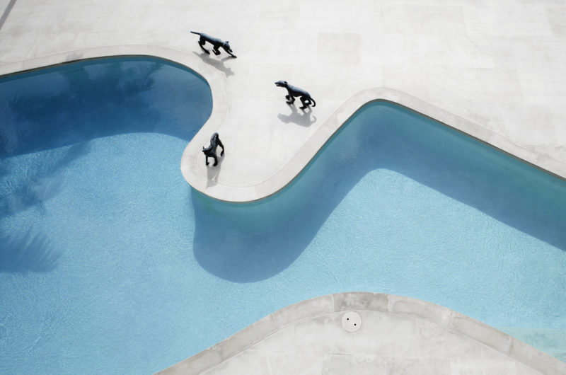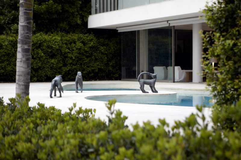 The façade that faces the water features balconies and terraces that are easily accessible through large sliding glass doors. Each floor has a wall covered in Belgian linen or Oak, and adorned with the owner’s collection of contemporary art. The free-form pool is also almost like a work of art on the harbor level terrace.