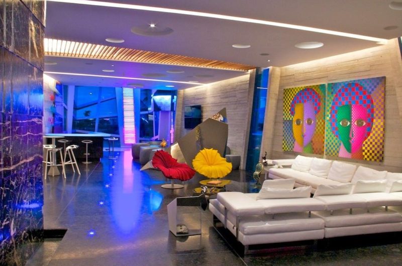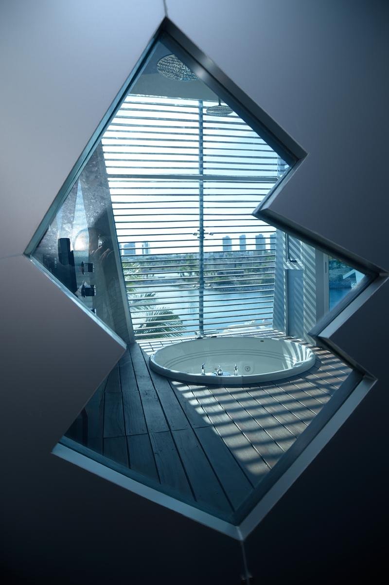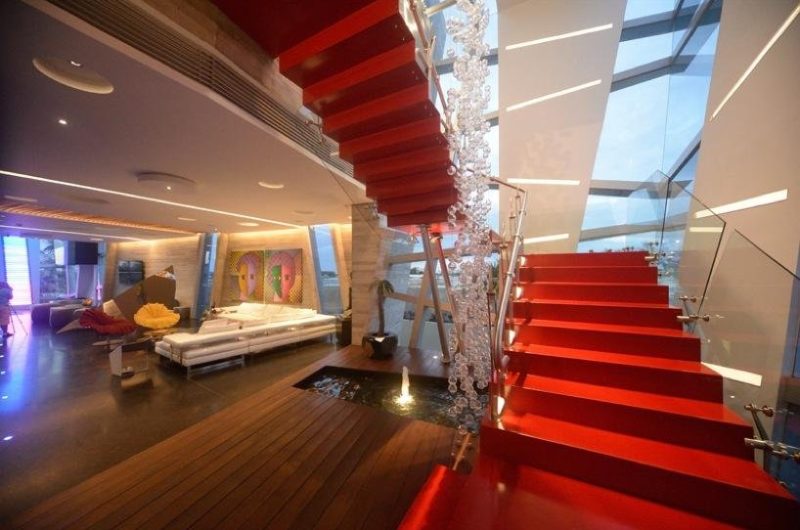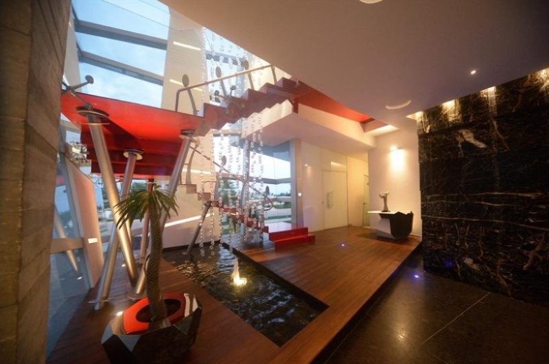 It can be observed an avant-garde tendency because of the materials and textures used and due to the combination of apparent concrete walls, granite and wood floors, large windows, the glass and aluminum covers and the specific Bisazza mosaic accents.
