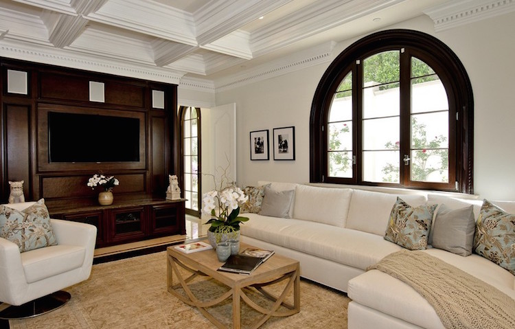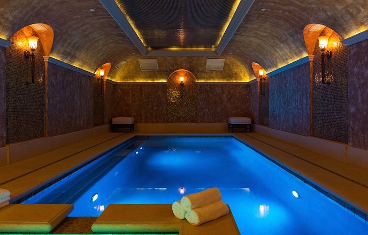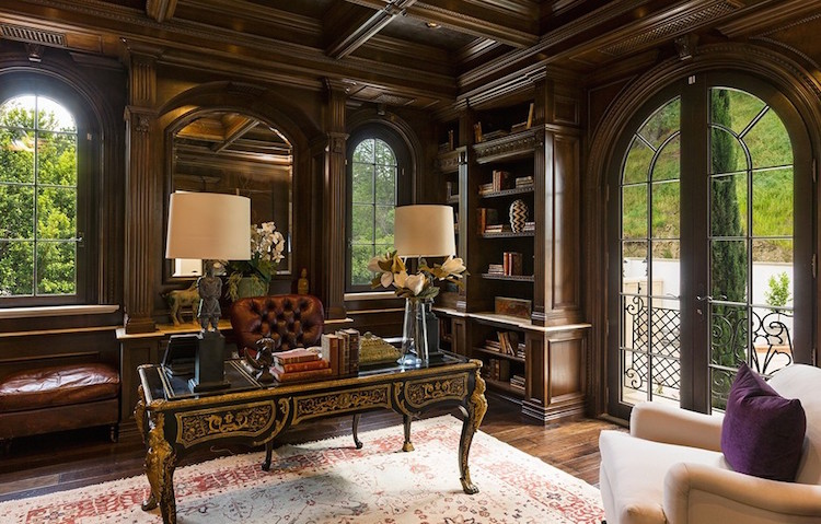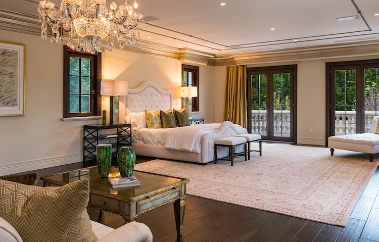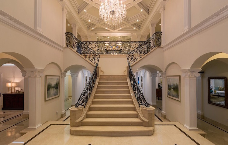 Inside, the abode looks like it was designed to be inhabited by royalty. It boasts a 30-foot high formal entrance as well as premium finishes, hardwood floors, spacious formal rooms, soaring ceilings and Corinthian columns. The property includes an indoor and an outdoor swimming pool as well as a separate guesthouse that was designed by the same architect.