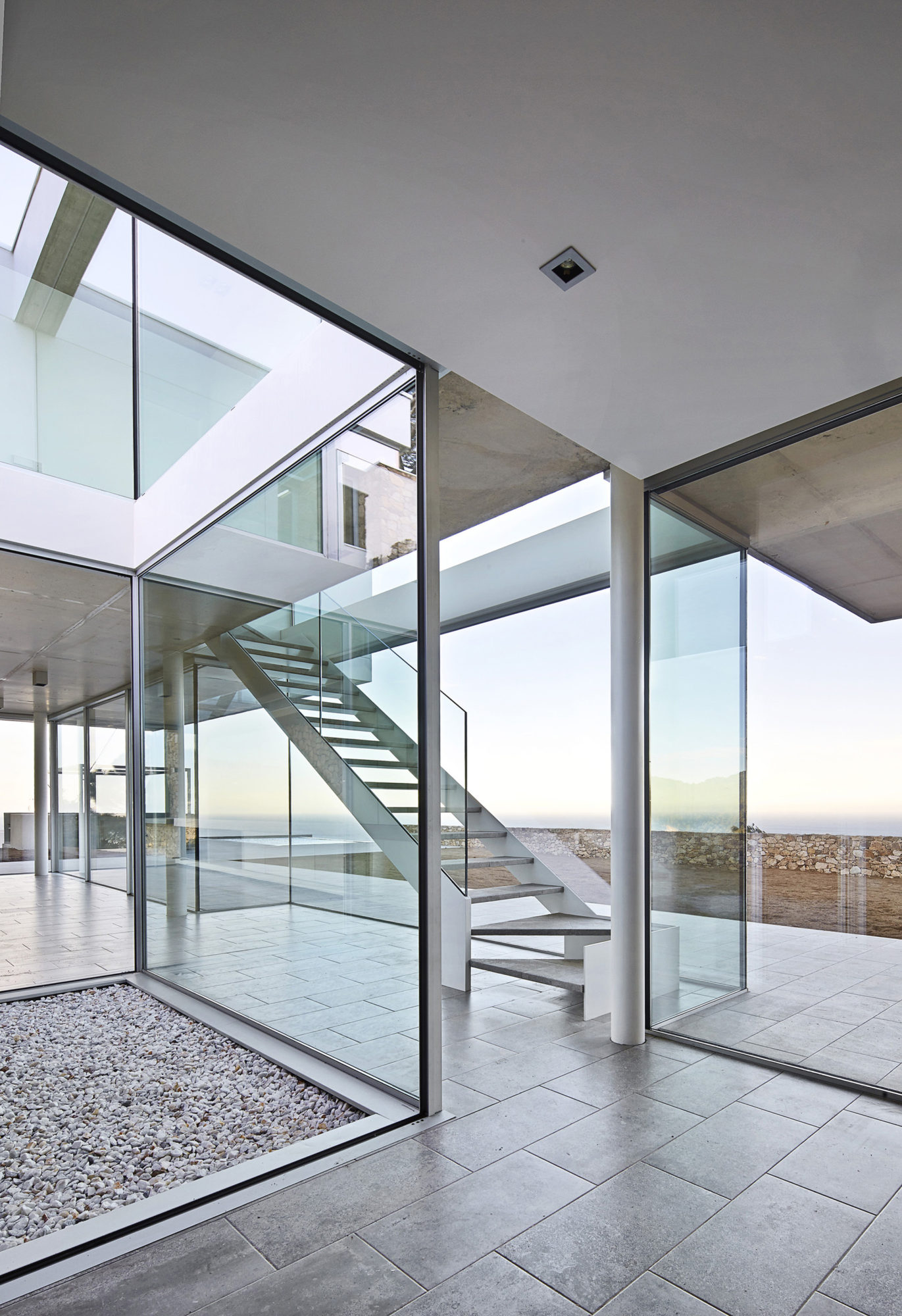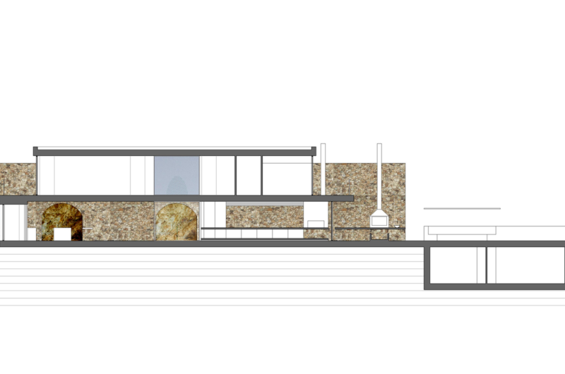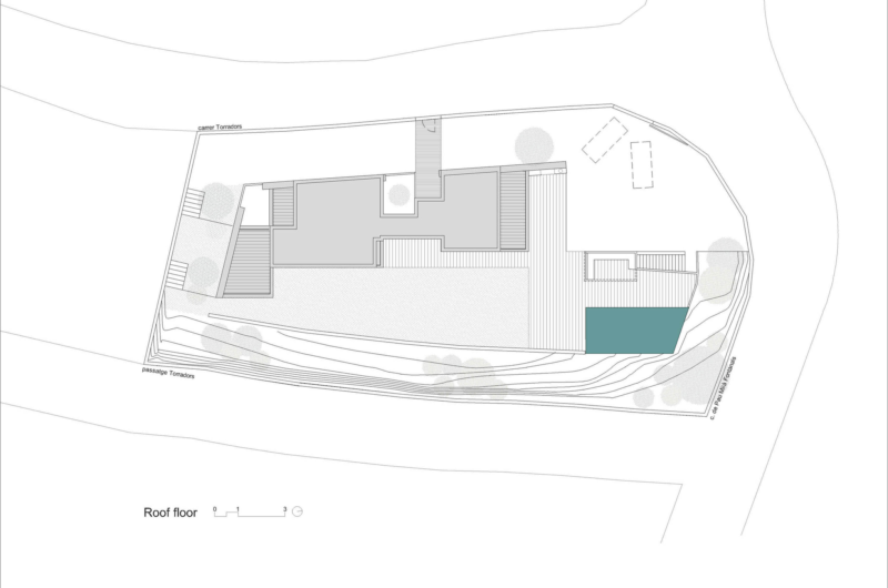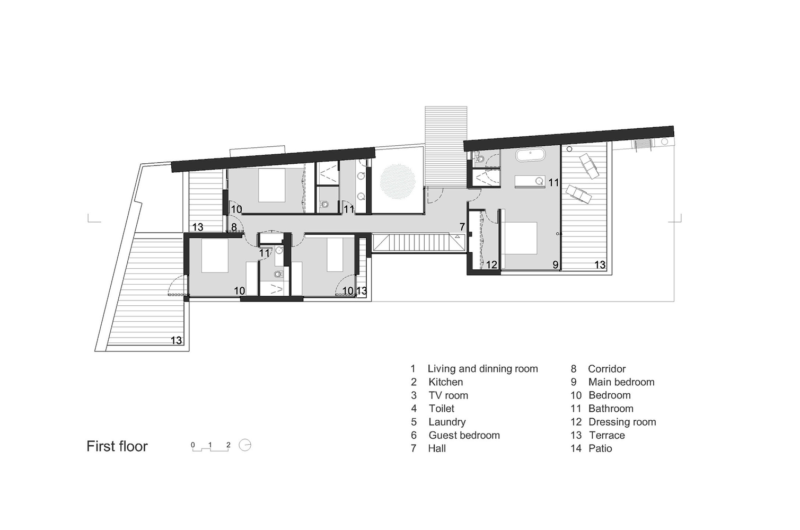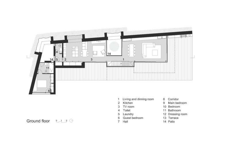 The home was built parallel with the access road, and it is actually sheltered by it. As such, the entrance can be found on the upper level and is directly connected to the aforementioned roadway, while the level below features a series of small courtyards, gardens and the public living arrangements. The 2 levels distinguish themselves with unique designs: one of them boasts opacity and compartmentation while the other features transparency and utmost openness.