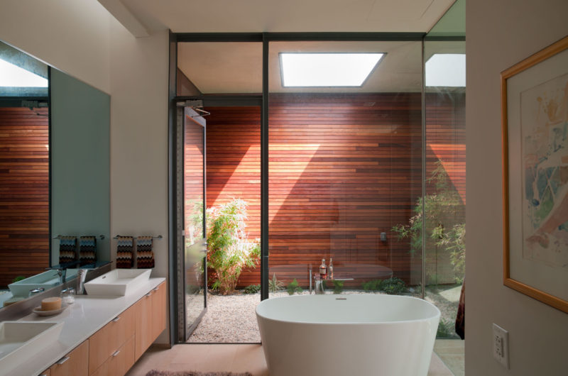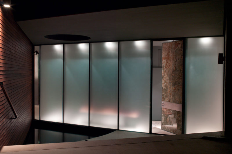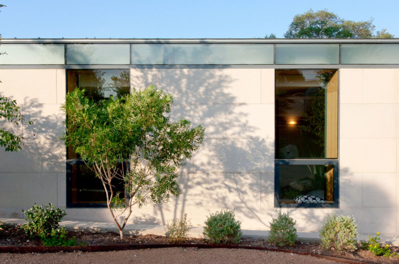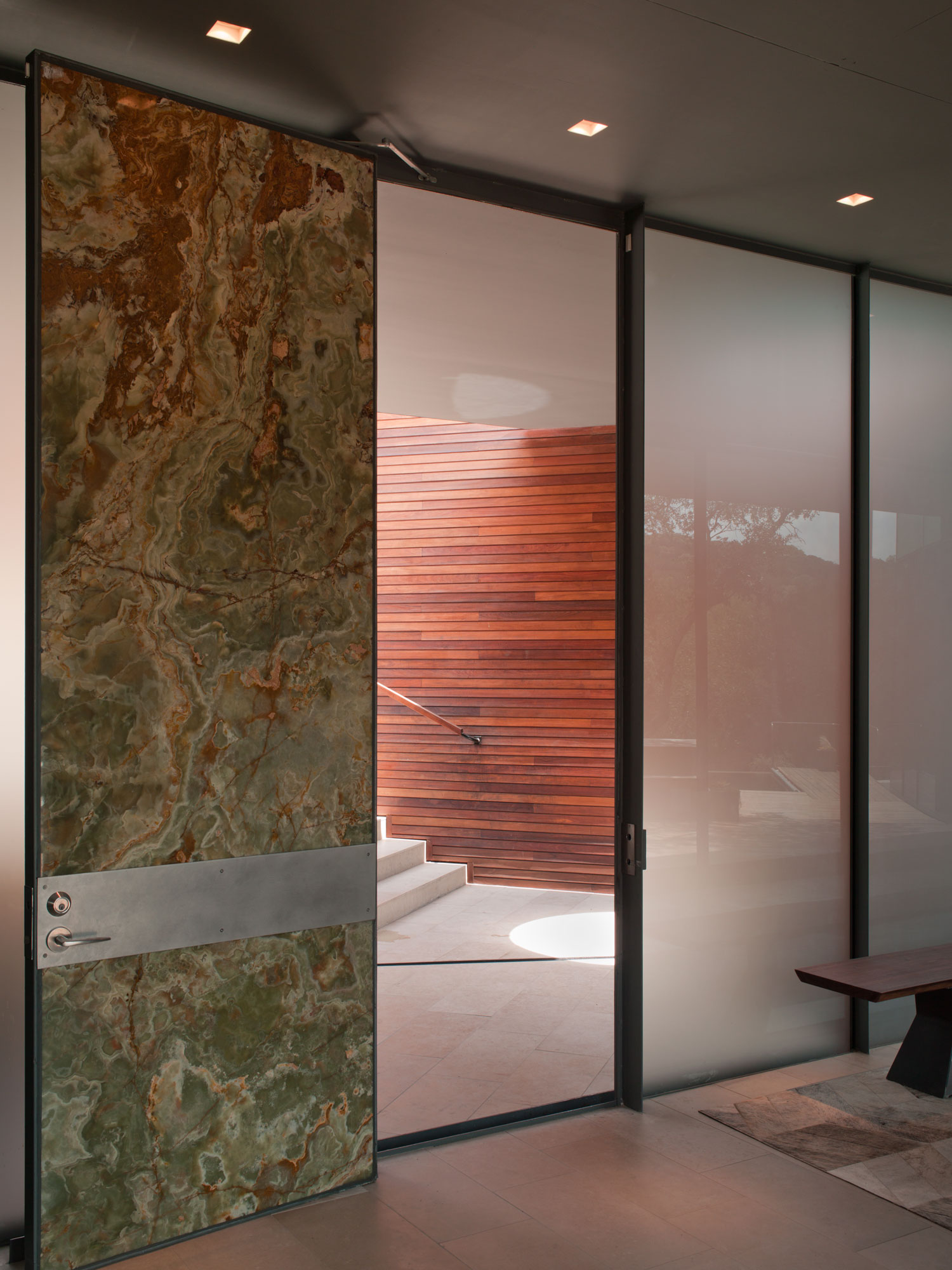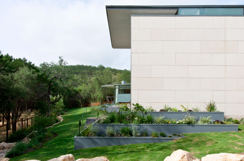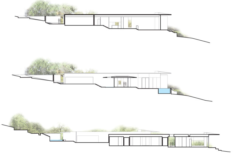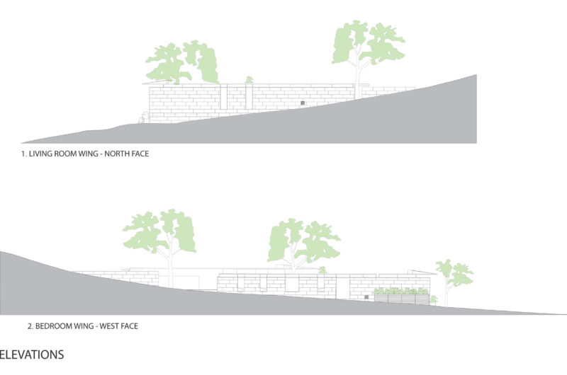 Two limestone walls, which are the spine of the entire architecture, split from the front to create the public and the private areas. These two walls open towards the landscape and the creek below, creating the impression of an extended living space protected from the torrents of rainwater draining from the street above.