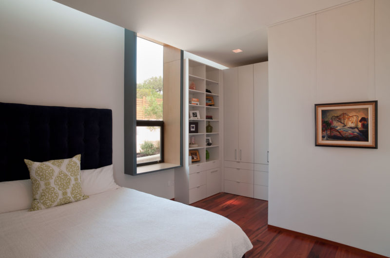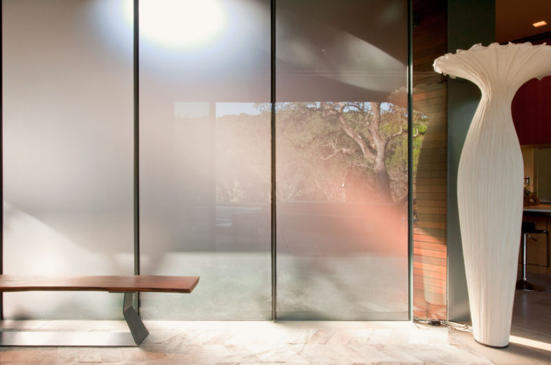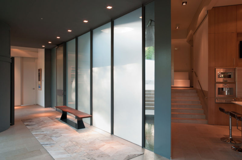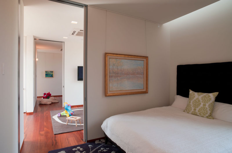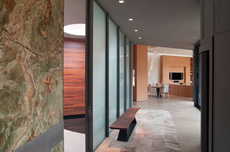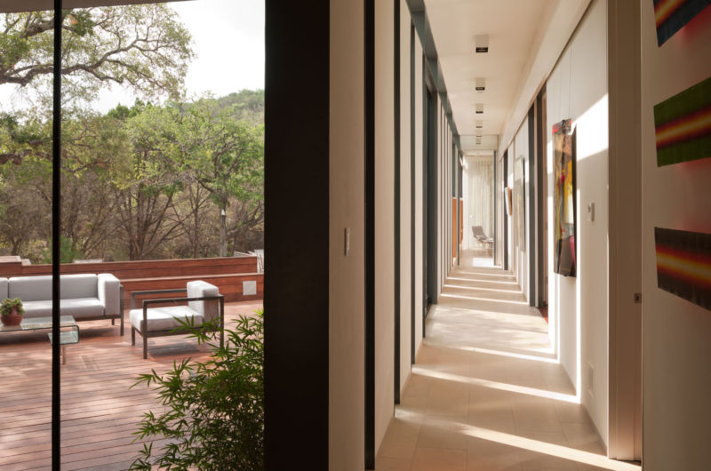 The house has some amazing sustainable features such as photovoltaics, hydronic heating and cooling and rainwater collection. Rainwater is collected in a natural basin created by the specially configured roof. From here, water, energy and heat flow through a system of photovoltaic and solar hot-water panels to provide the heating and cooling of the residence. Heat is also provided by geothermal ground loops and so reliance on electricity and gas is minimized.