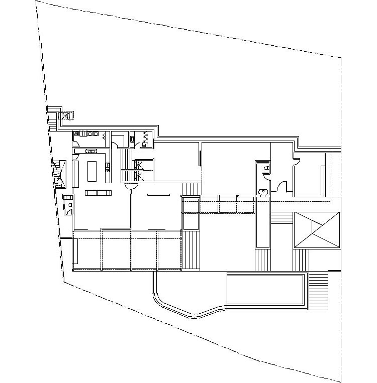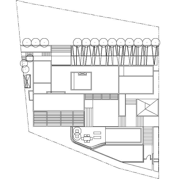 The steep slope on which the CG House was built was both a challenge and an opportunity for the architects. They had to overcome some difficulties, but now guests can enjoy sweeping views towards the garden and the city. The special topography of the site also required a massive concrete wall to enclose and define the garden and swimming pool areas. The house itself is clad in brown/black volcanic stone, white stucco, IPE wood and steel.