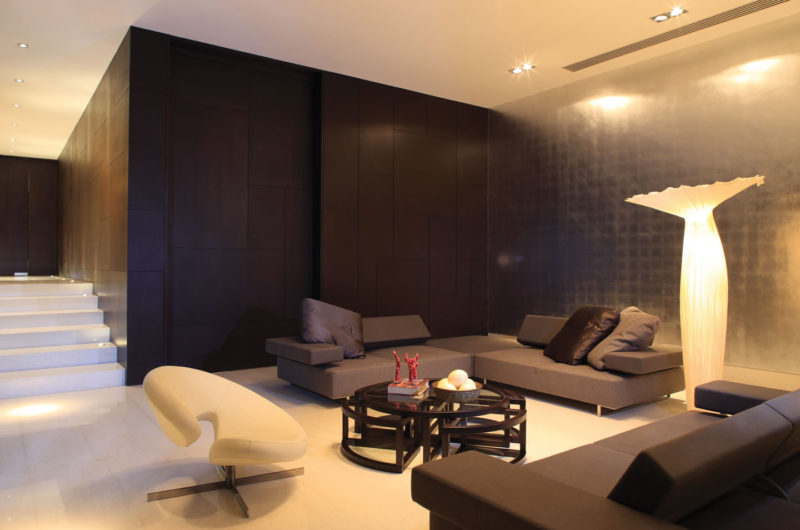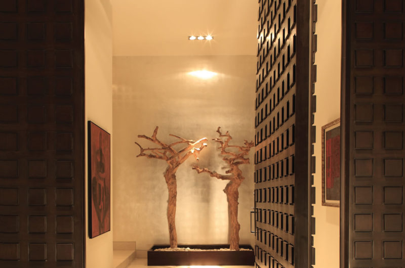 A 12-ft high dark oak door opens to an imposing home with a grand foyer featuring 15-foot high walls decorated with silver leaf. Also here guests can find a large sculptural piece of coconut roots, rocks and steel.