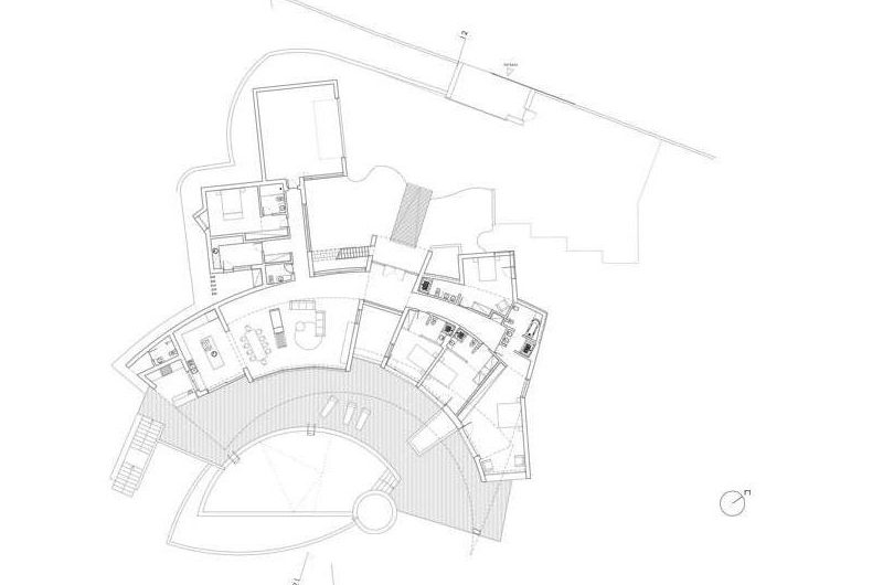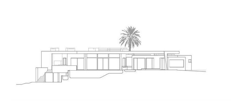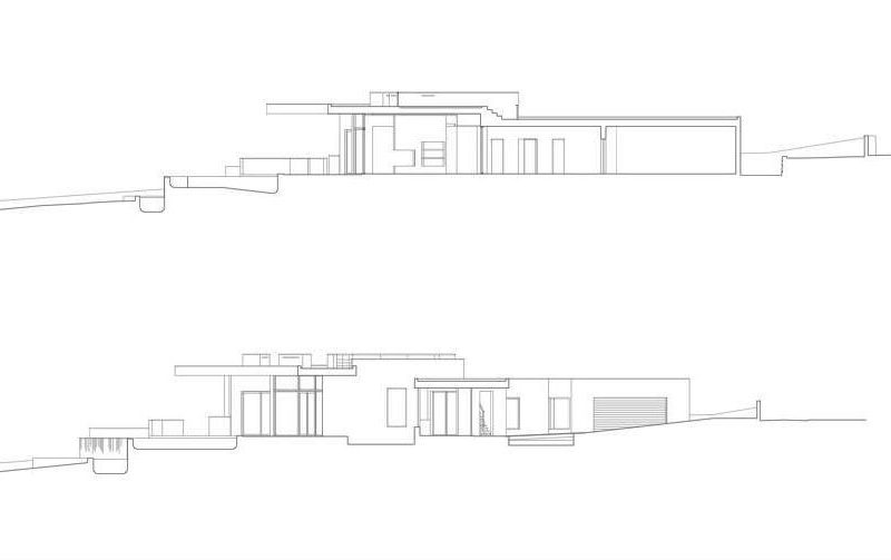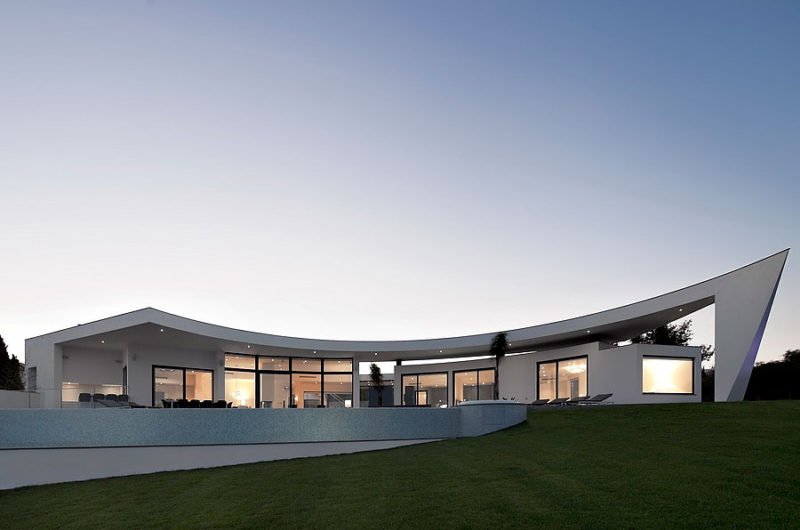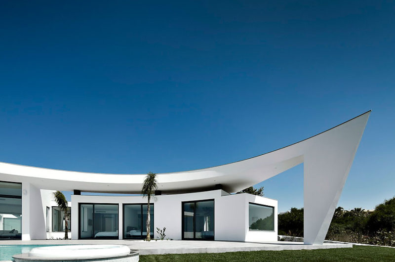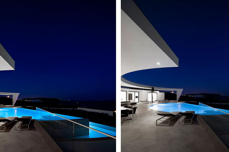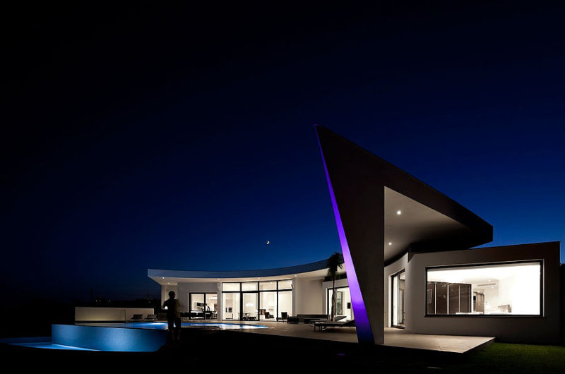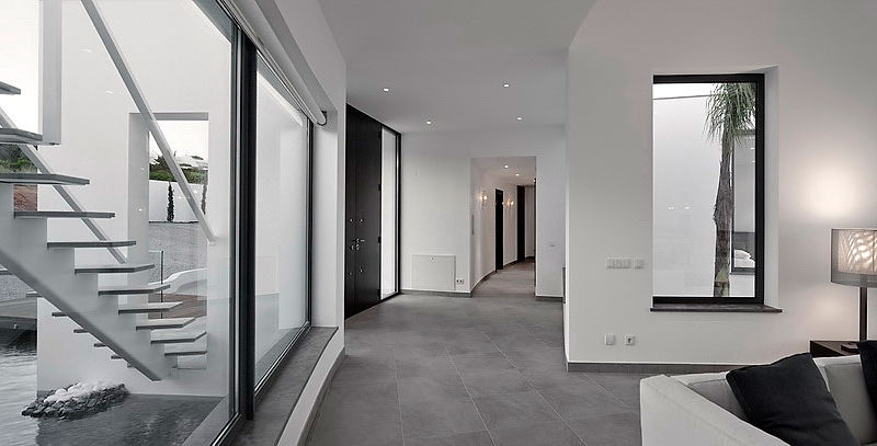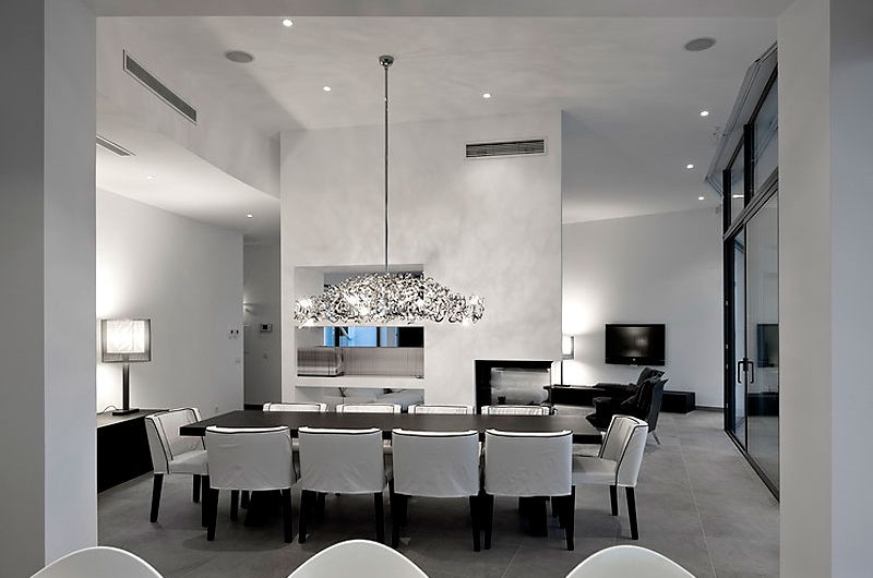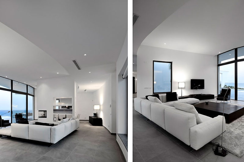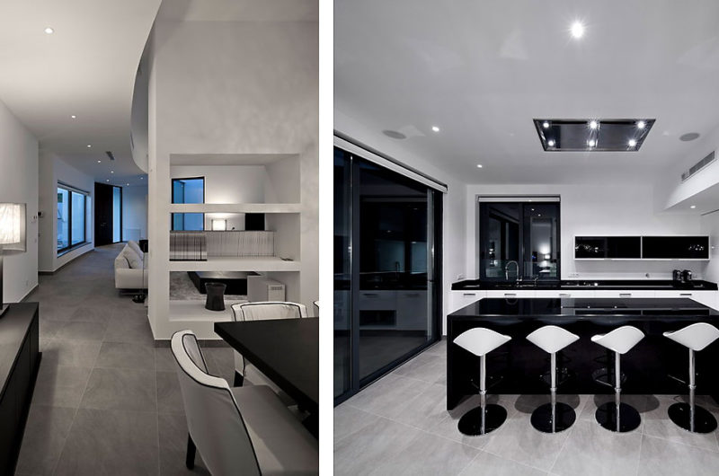 With a central terrace, a lovely pool, and an inviting outdoor living area, this residence is like a small personal resort in a superb natural setting. The dominant color of the house is white, but this bright shade is permanently balanced by strongly contrasting accents of black. The result is truly impressive, as the photos below show.