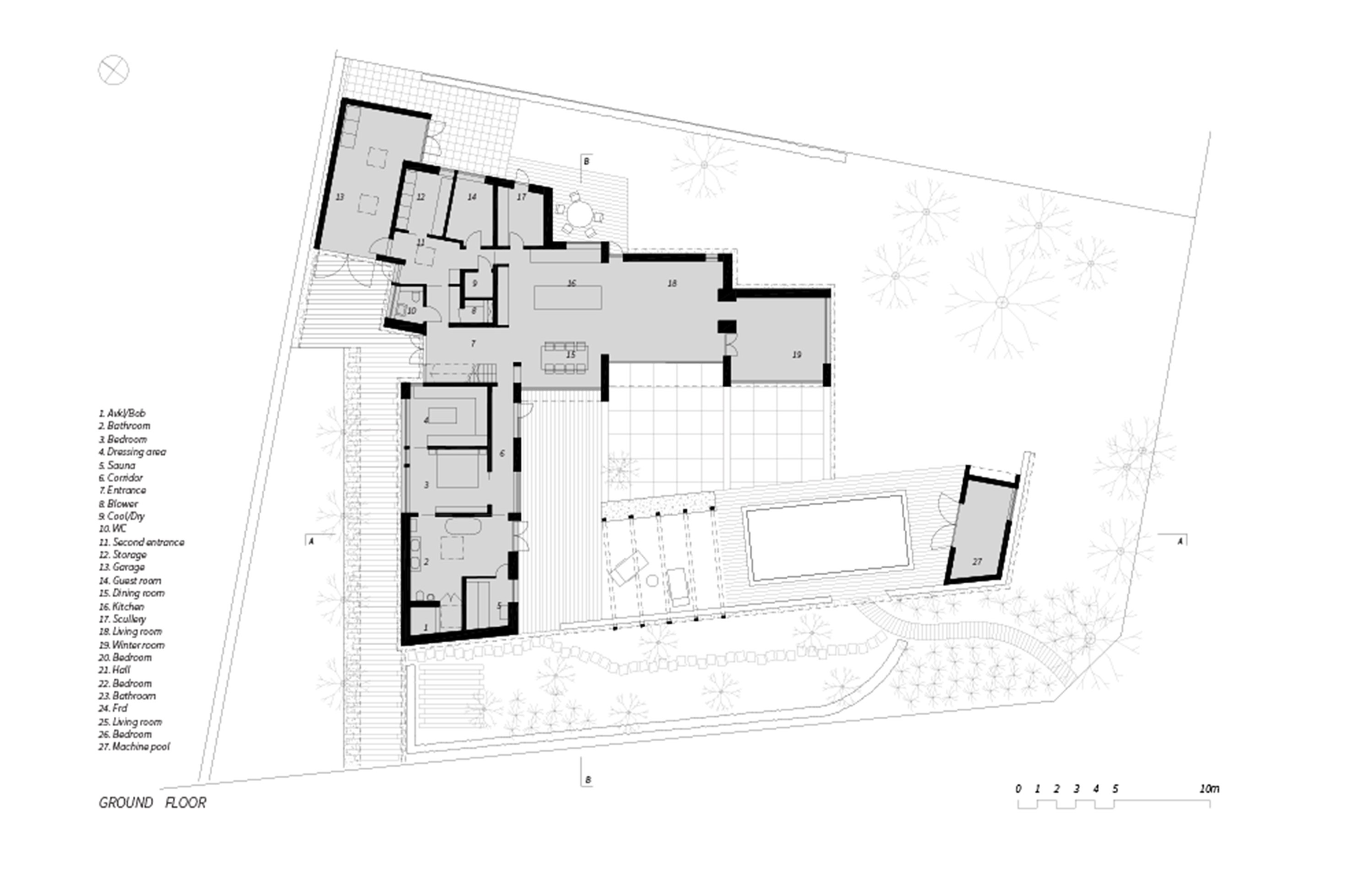 The ground level incorporates the social areas as well as a kitchen, a sauna, a winter garden and a luxurious master bedroom. The other bedrooms, the main bathroom and the living room are found on the upper floor, which also acts as a preferred playground for the children. Thanks to its ingenious design, Villa J is able to provide social and private living conditions at the same time. This was possible by implementing a simple floor plan that facilitates the transition between different rooms.